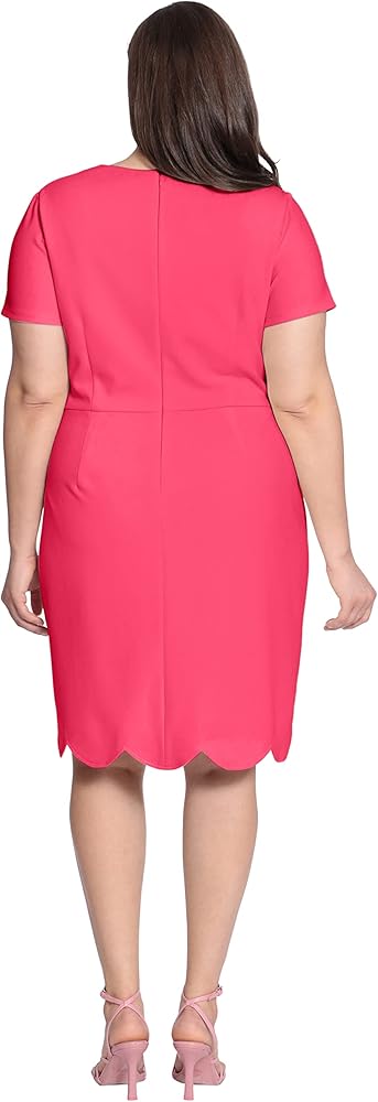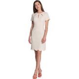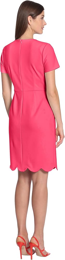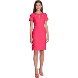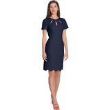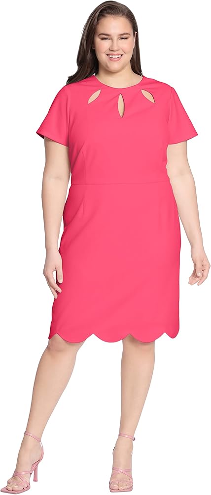 Jewel neck with 3 keyhole openings, short sleeves, princess darts off of waist seam, and an above the knee length pencil skirt with scalloped hem detail.
