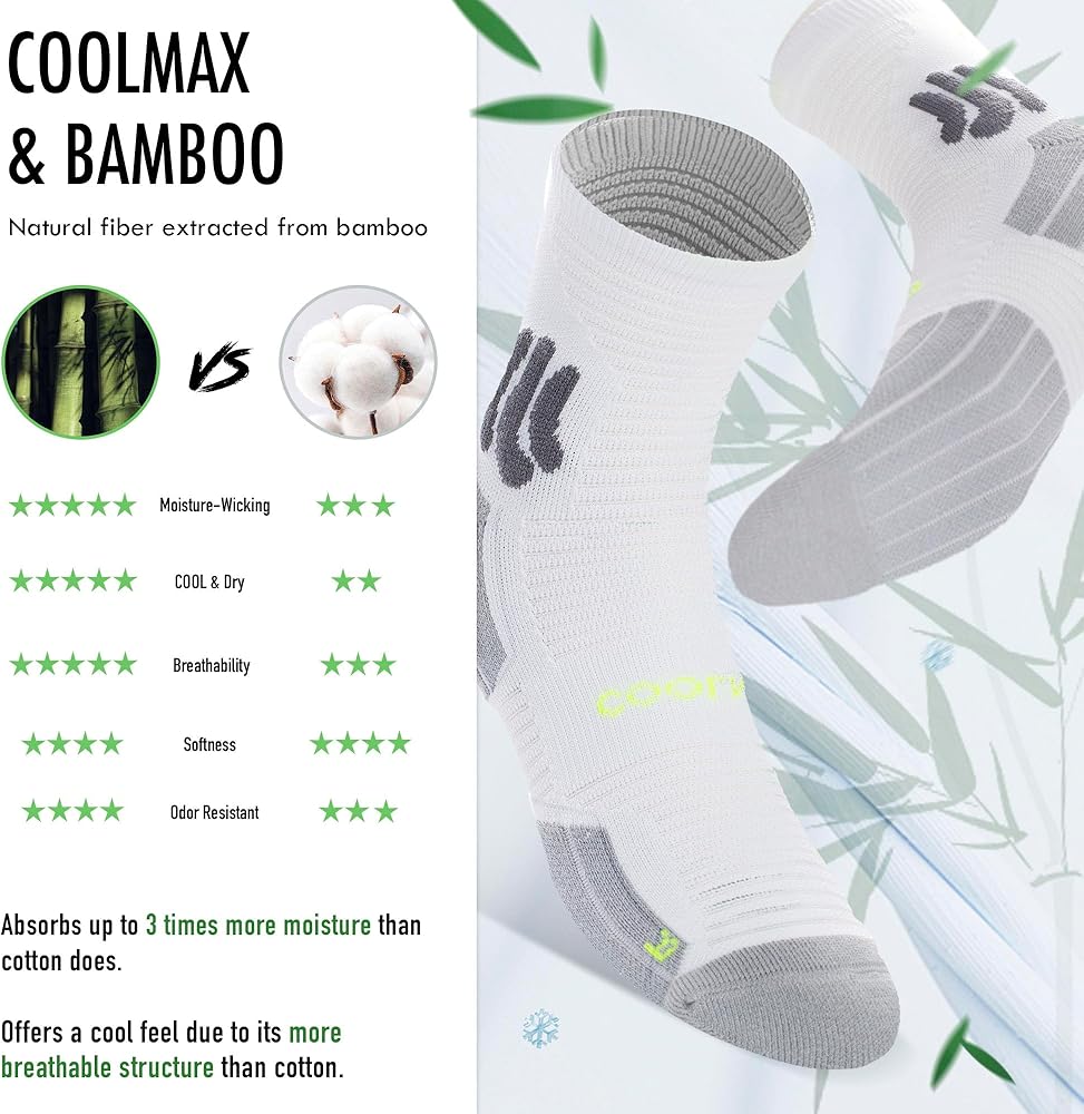 [Brethable - Coolmax & Bamboo Fibre]The high quality tech material brings extreme breathability and moisture wicking to the running socks, mesh in turn brings a soft touch. In addition, the seamless process enhances the comfort and durability of these compression socks. Nice anti-Odor socks help you avoid embarrassment.