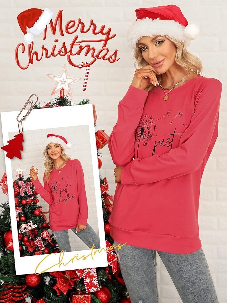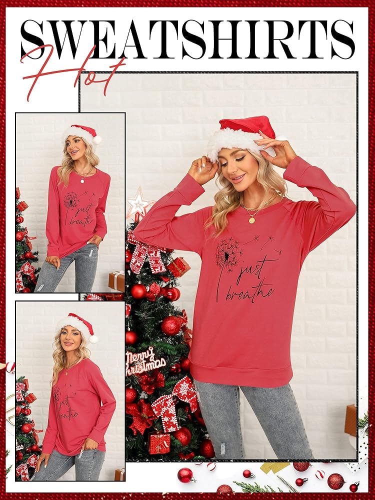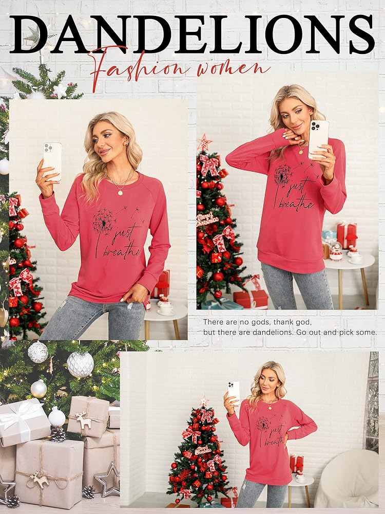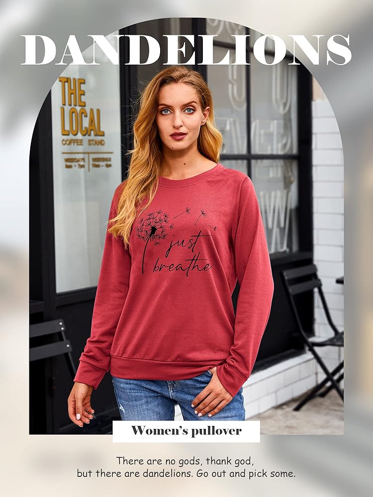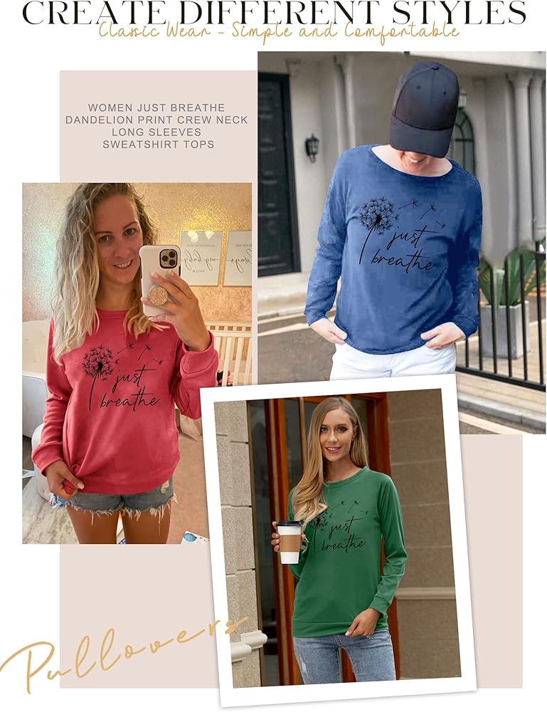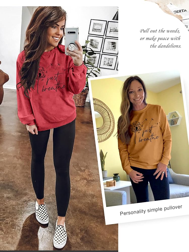 FEATURES: Just Breathe Shirt, Funny Letter Printed Shirt, Long Sleeves, Pullovers, Long-Sleeved Shirts, Stylish Shirts With Dandelion Graphic, Simple And Stylish Designs Make You More Attractive Loose Thin Crewneck Cozy Graphic Sweatshirts.