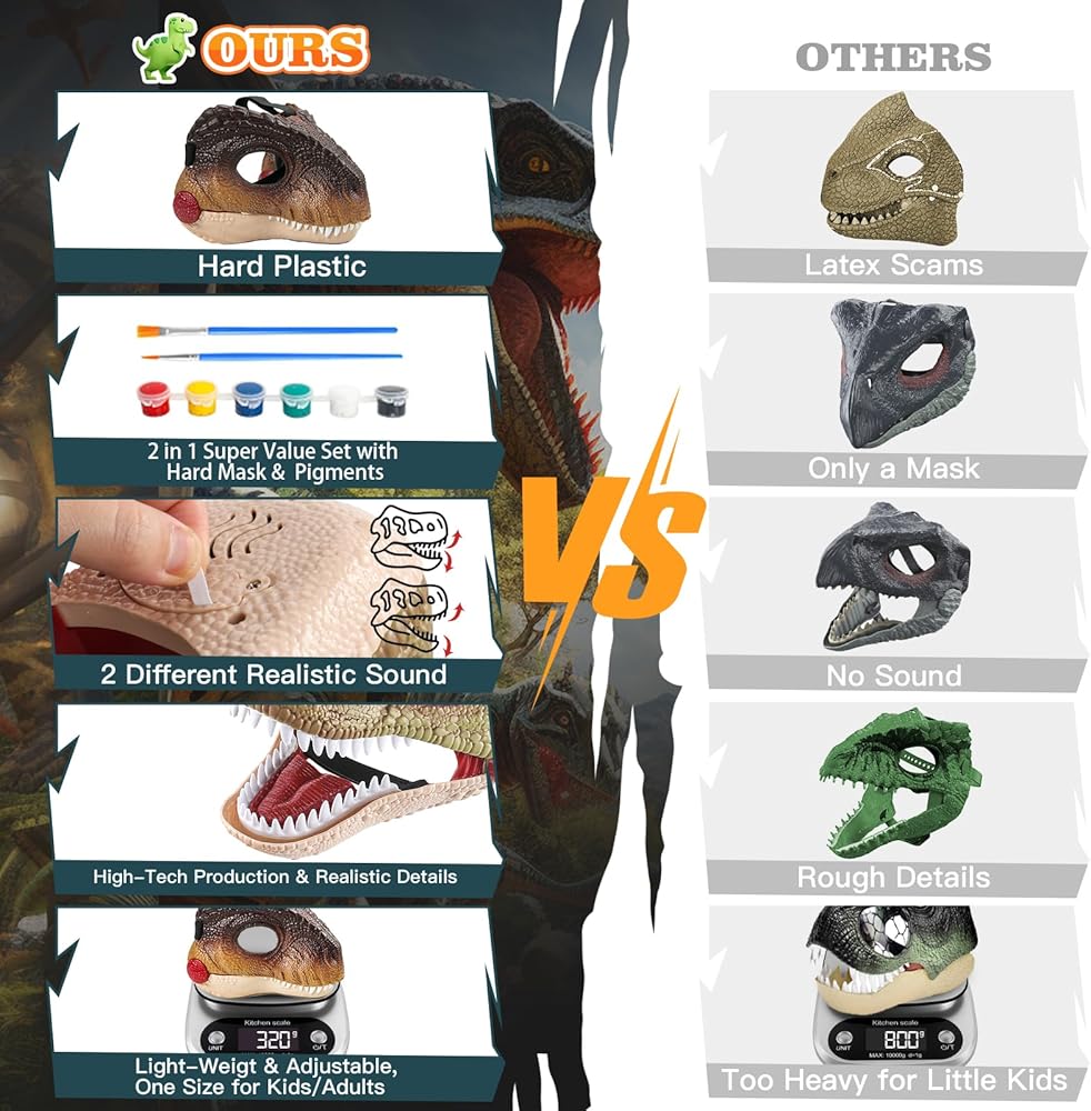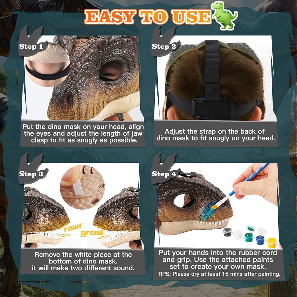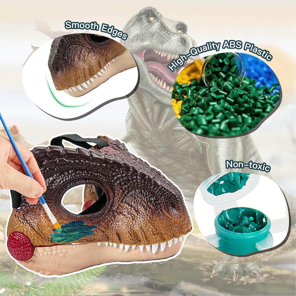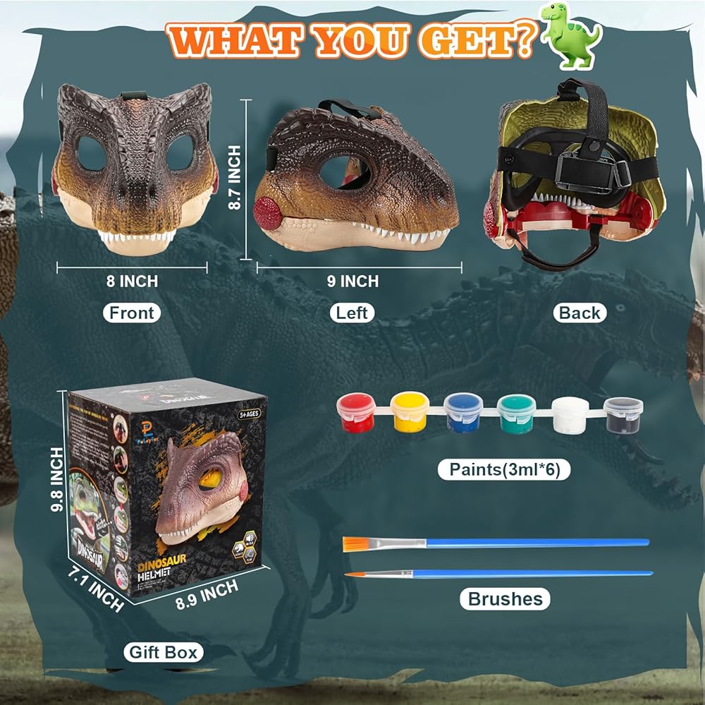 🦖💯Hard-Plastic 2 in 1 Dino Mask Set - You will get a dino mask ( 8*9*8.7in ) with 2 sound, 6 color paints (3ml x 6) and 2 brushes( 6.5in ). The adjustable strap on the mask can fit most kids. More important, the weight of the mask is only 320g, don't worry about too heavy for your kids. You could customize your own mask with attached paints. Perfect for dinosaur enthusiasts and the furry.
