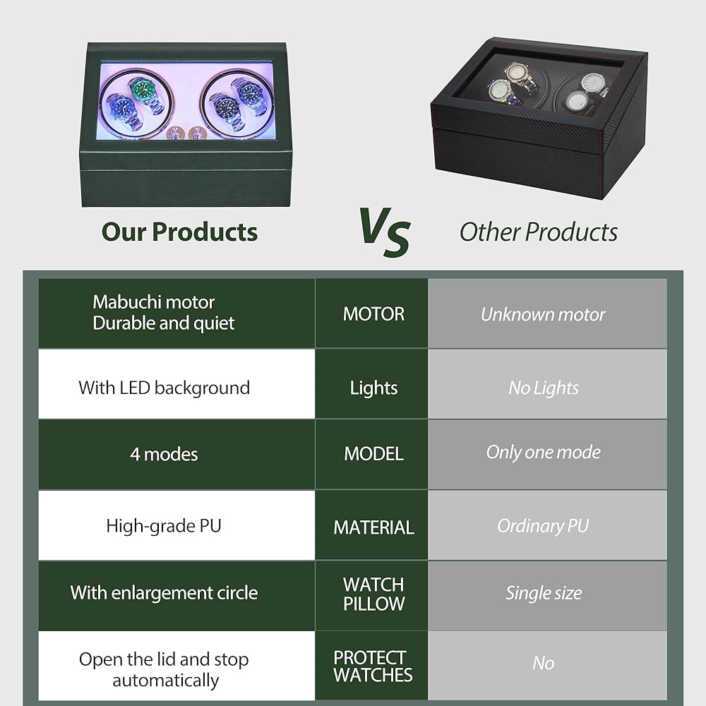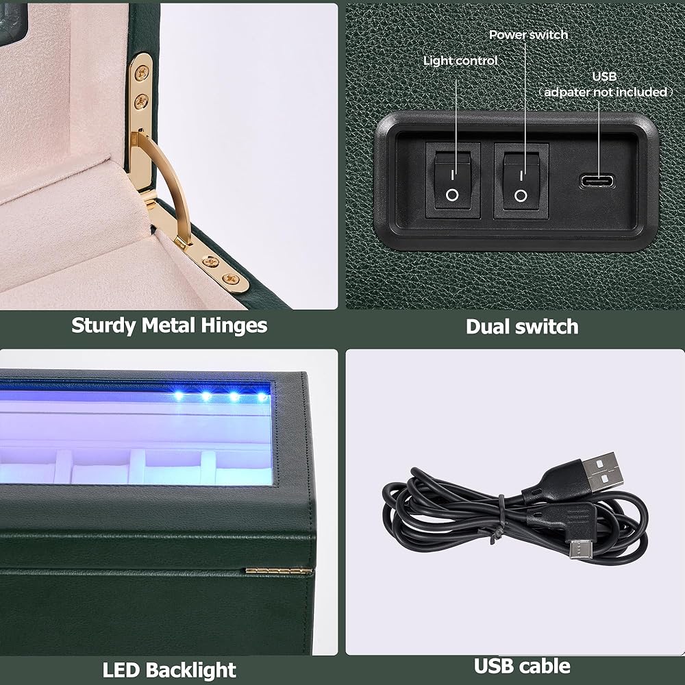 LUXURY WATCH SHAKER: The surface is treated with piano paint technology, elegant and luxurious. Product size 13.39”L X 9.17”W X 6.69”H. The design of opening the cover and stopping rotation is very thoughtful. Ant-magnetic keep your watch safe and running very precision. Built-in LED backlight enhances the display atmosphere