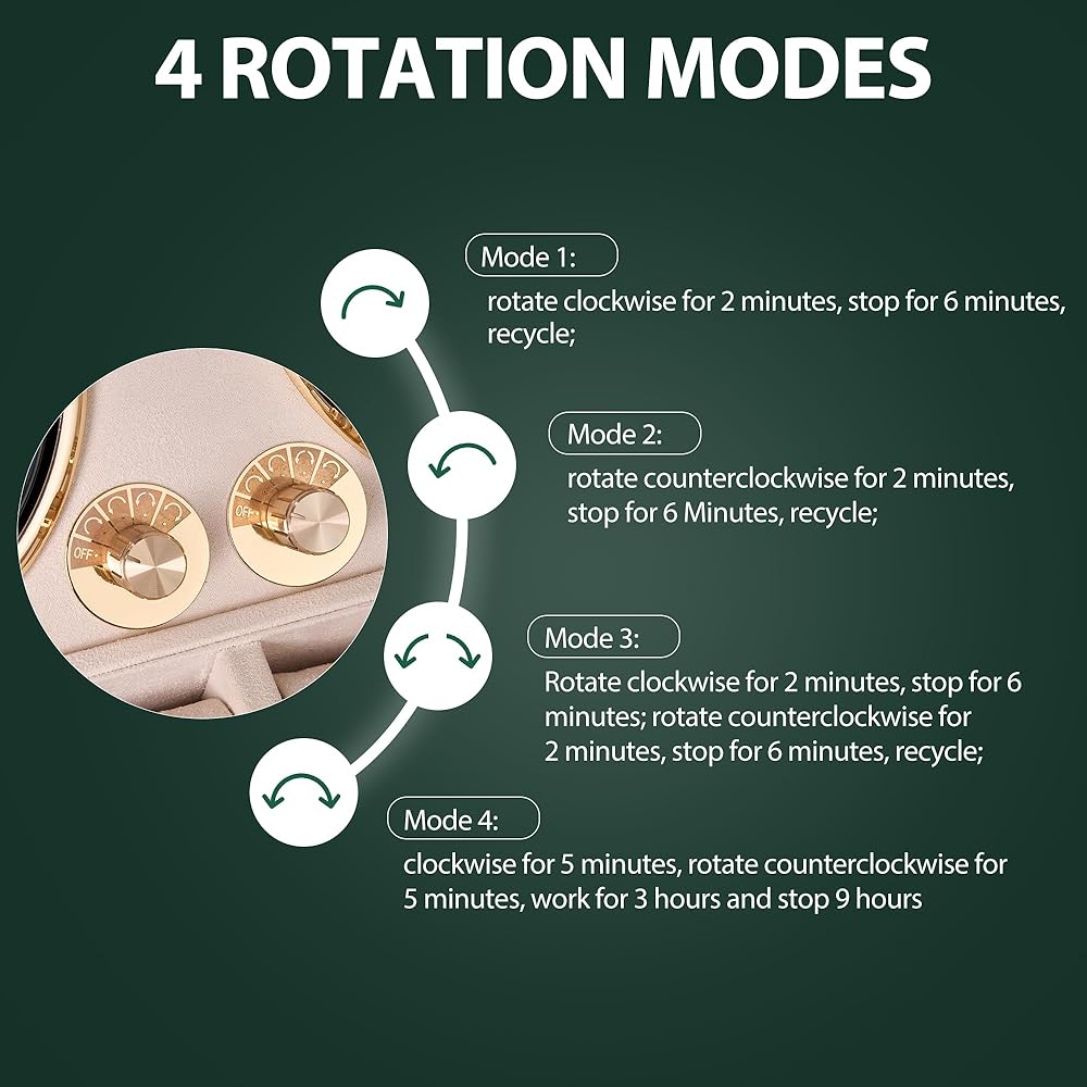 4 ROTATION MODES WATCH TURNER: Mode 1: rotate clockwise for 2 minutes, stop for 6 minutes, recycle; Mode 2: rotate counterclockwise for 2 minutes, stop for 6 Minutes, recycle; Mode 3: Rotate clockwise for 2 minutes, stop for 6 minutes; rotate counterclockwise for 2 minutes, stop for 6 minutes, recycle; Mode 4: clockwise for 5 minutes, rotate counterclockwise for 5 minutes, work for 3 hours and stop 9 hours