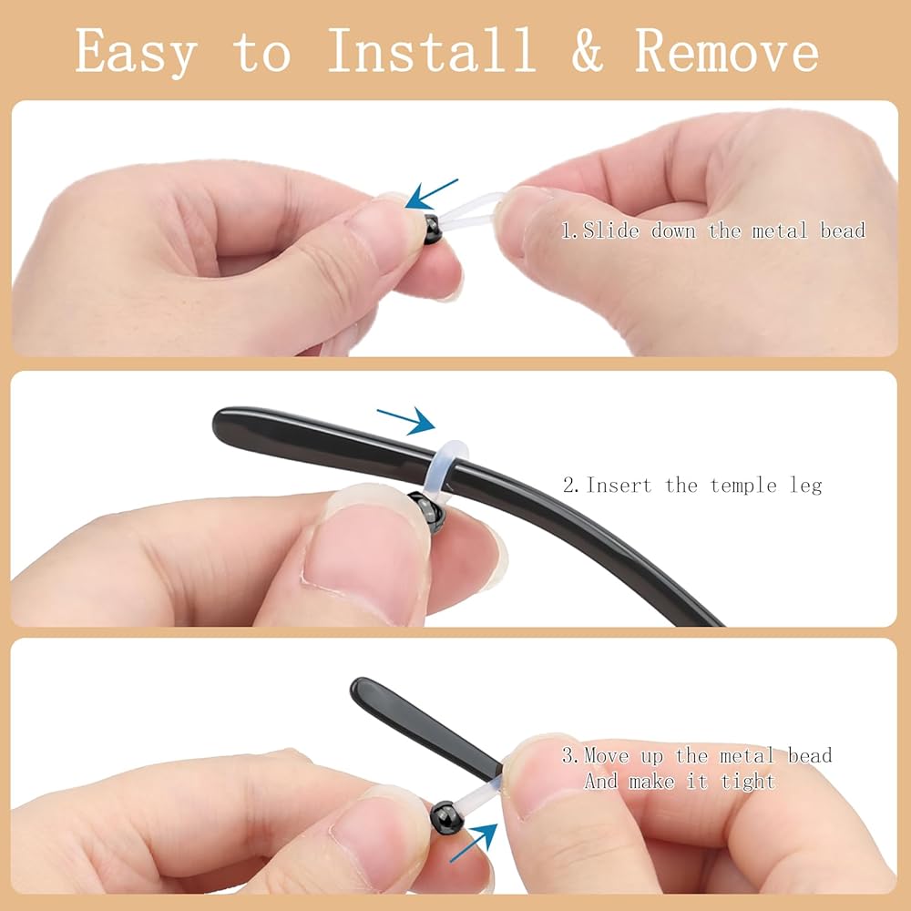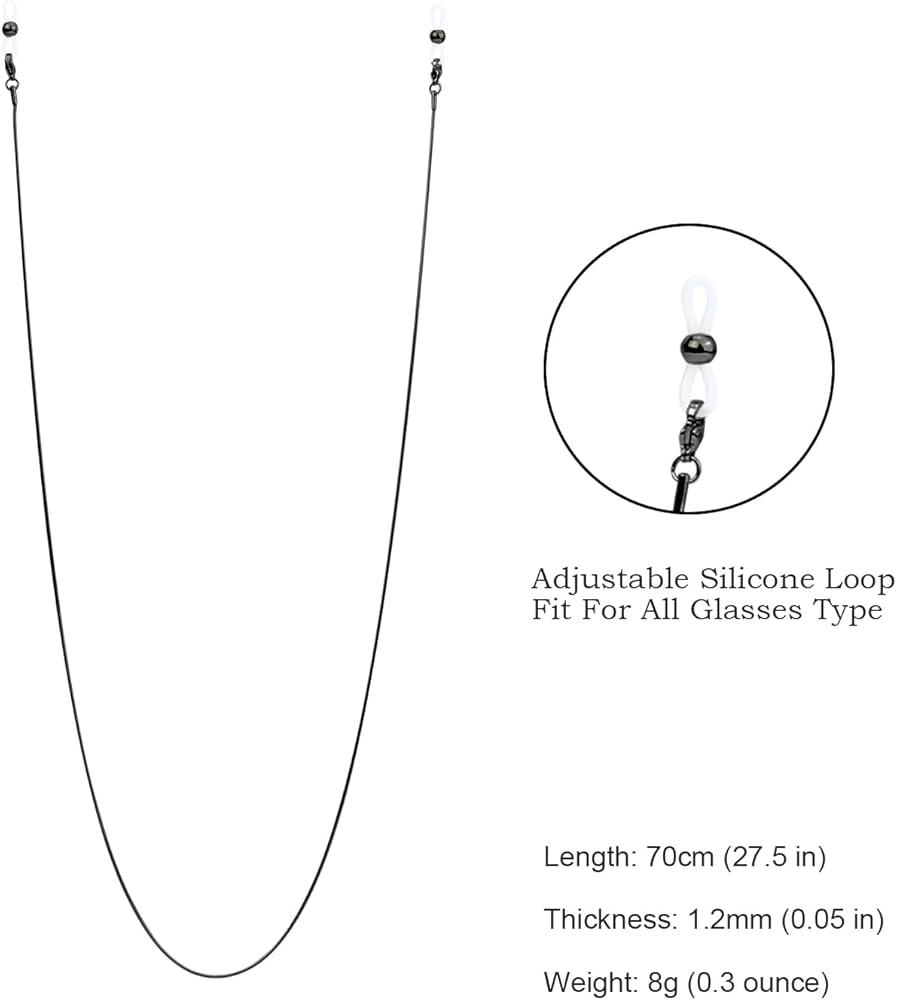 【Proper Size】 The length of glasses lanyard measures appropriately 27", it's the proper length to hang just around the neck. The silicone loops from both end of the chain is adjustable, they can be tighten or loosen, to make sure it holds the glass as tight as you want it be(suitable for all glasses and sunglasses types). It's an absolutely handy, practical and pretty accessory for your eyeglasses.