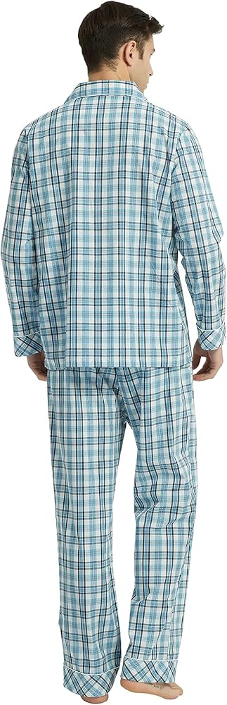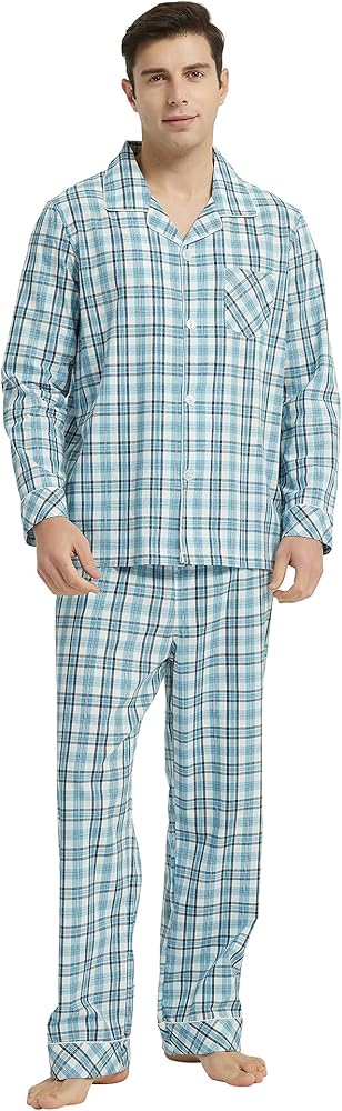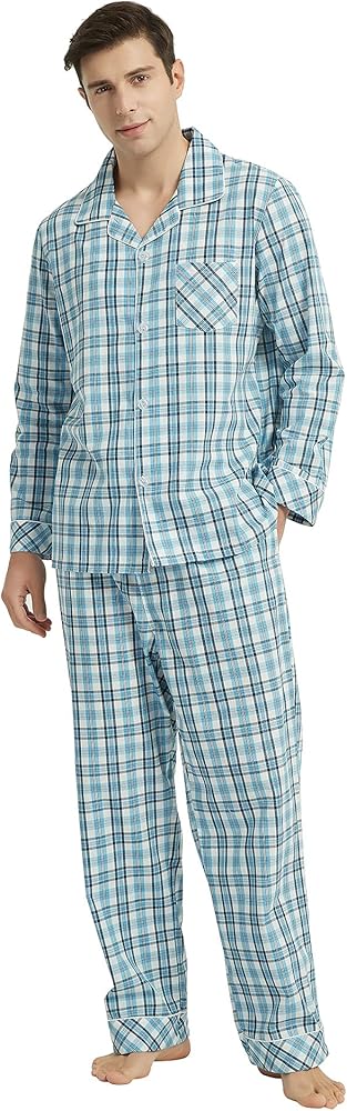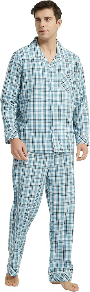 √Classic design: The soft mens pajama sets with classic lapel and plaid design. The pjs with button front and a notch collar, chest pocket,The woven process makes the pajamas more neat and stylish,Pants have a front fly.