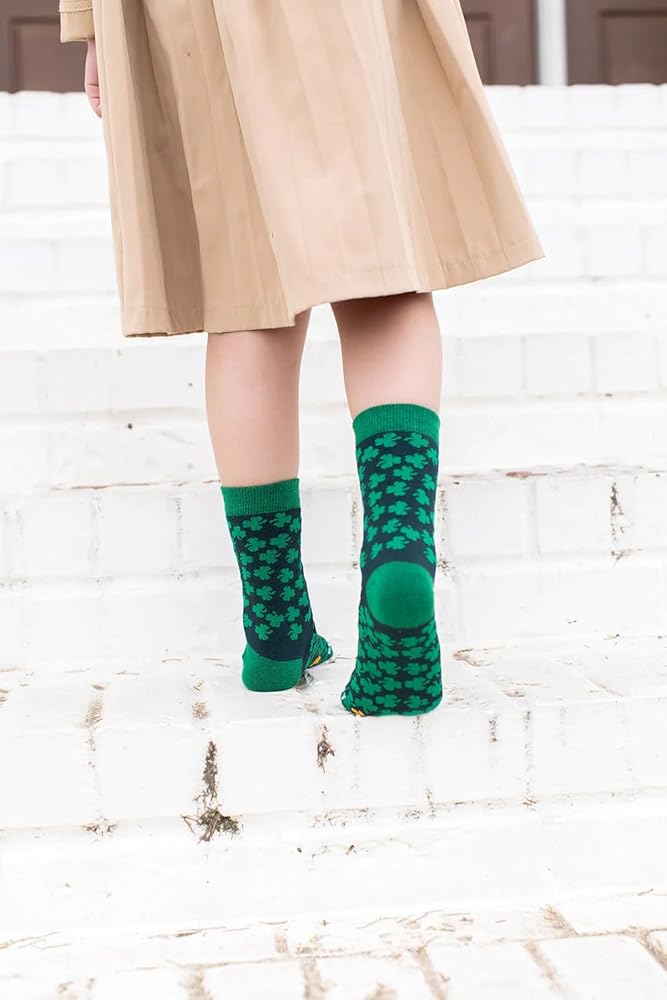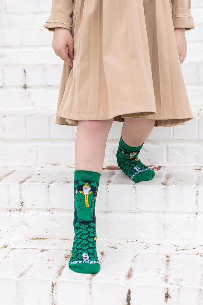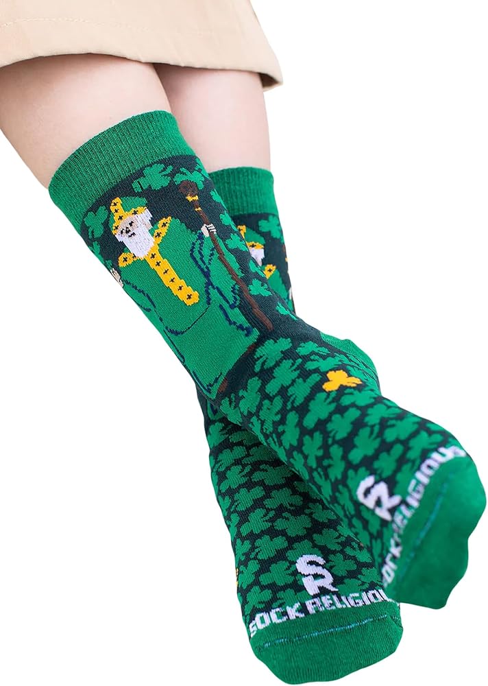 Sock Religious, St. Patrick, Shamrock Green Four-Leaf Clover, Boys and Girls One Size Fits Most Polyester Blend Catholic Inspirational Fun Crew Socks, Kids