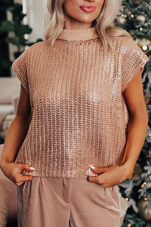 Feature: Women's casual sweater top features surface metallic, pullover, glitter, short sleeve, turtleneck, knit, and loose fit. Shiny summer tops for women, spring tops for women 2024