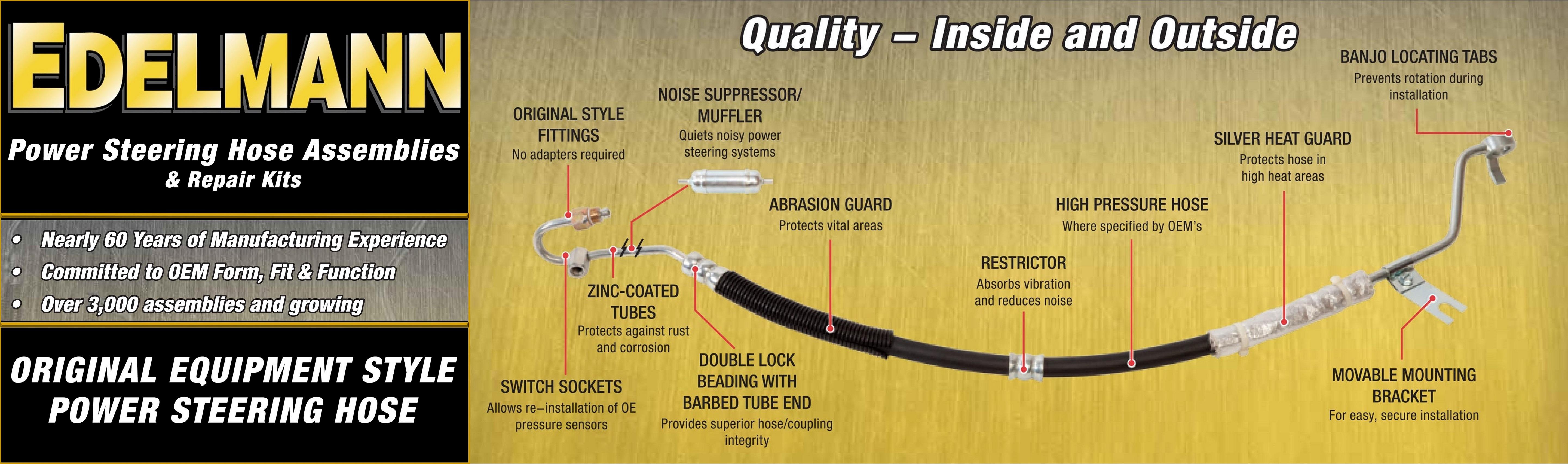 Edelmann OE quality power steering hoses and components are crafted from long-lasting, high-performing materials that ensure durability under the harshest conditions on the road