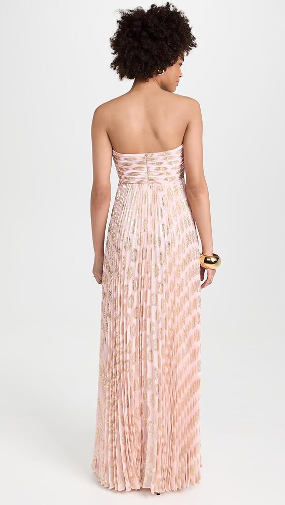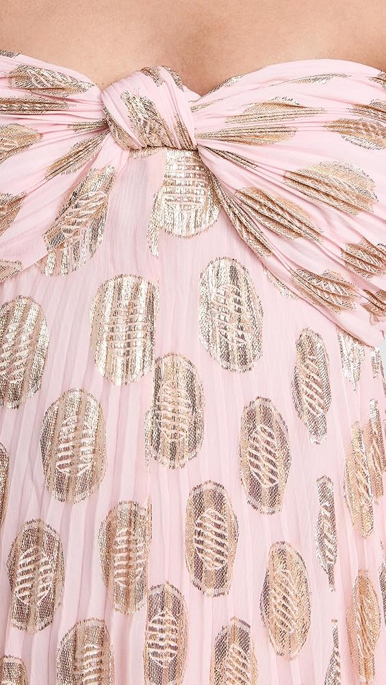 Runs slightly large; those between sizes may want to size down., Designed with an A-line silhouette and maxi length. Strapless dress has a roomy fit at the bust. Chiffon fabric features flocked metallic polka-dots and has accordion pleats throughout.
