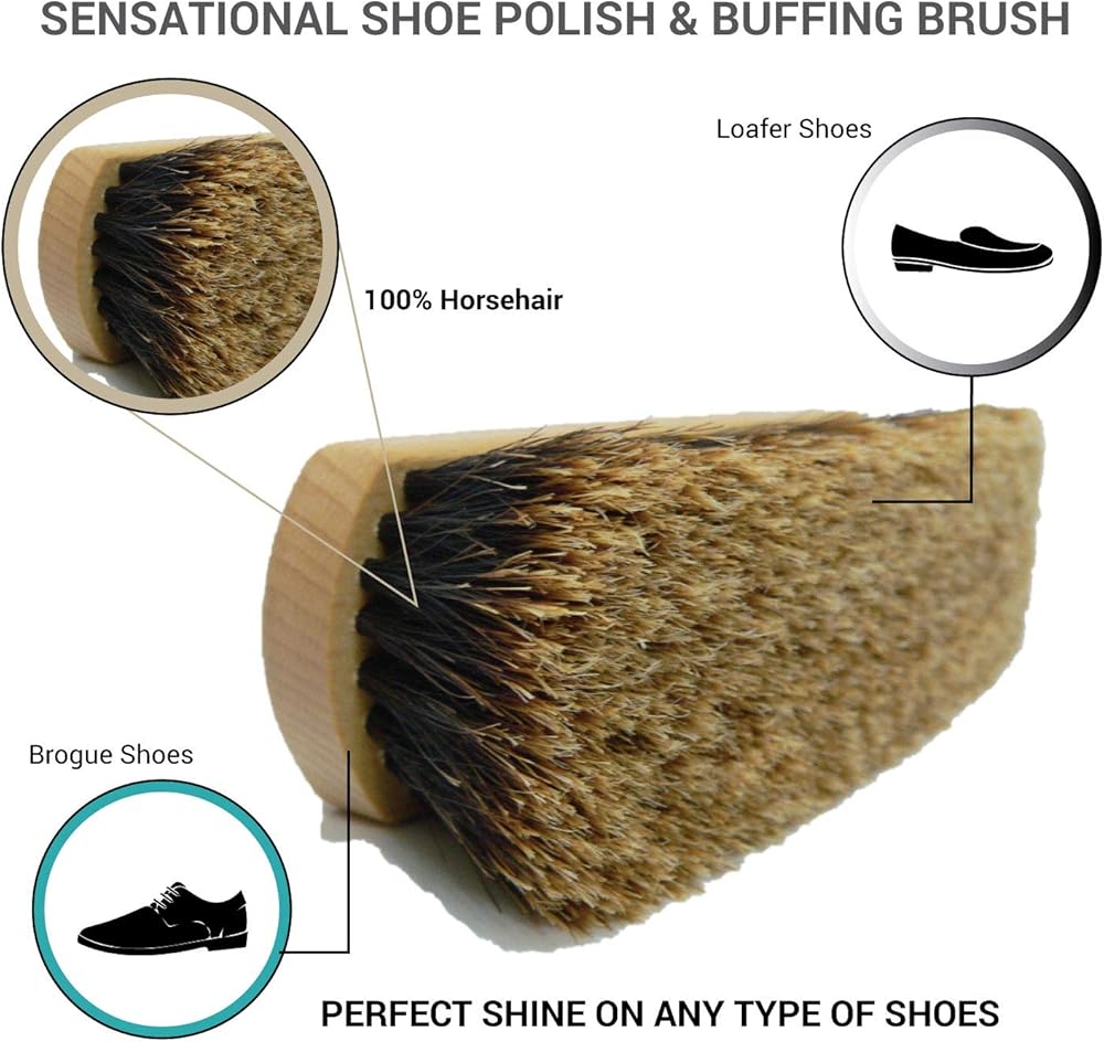 • شعيرات طويلة خاصة تعطي ميزة فورية لأي مستخدم للحصول على اللمعان المثالي على أي نوع من الأحذية بما في ذلك الأحذية بدون كعب أو ديربي أو أوكسفورد أو بروج أو راوند أو راوند أو إلخ. بسبب تقصف أطراف شعر الحصان، فإن الاتصال اللطيف هو المفتاح وسيمنح ميزة في منع الحصول على نتائج لامعة فائقة - آمنة للاستخدام على أحذية جلدية خاصة غريبة.