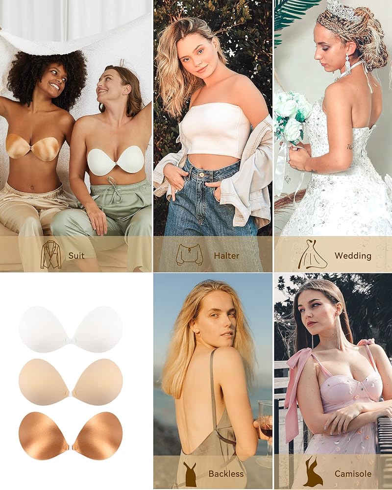 Self-adhesive Bra: Our sticky bras with strong adhesion inside the bra cup keep the backless bra attached to the breast, do not worry about falling off. And when you take it off, the Bio gel would not harm your skin.