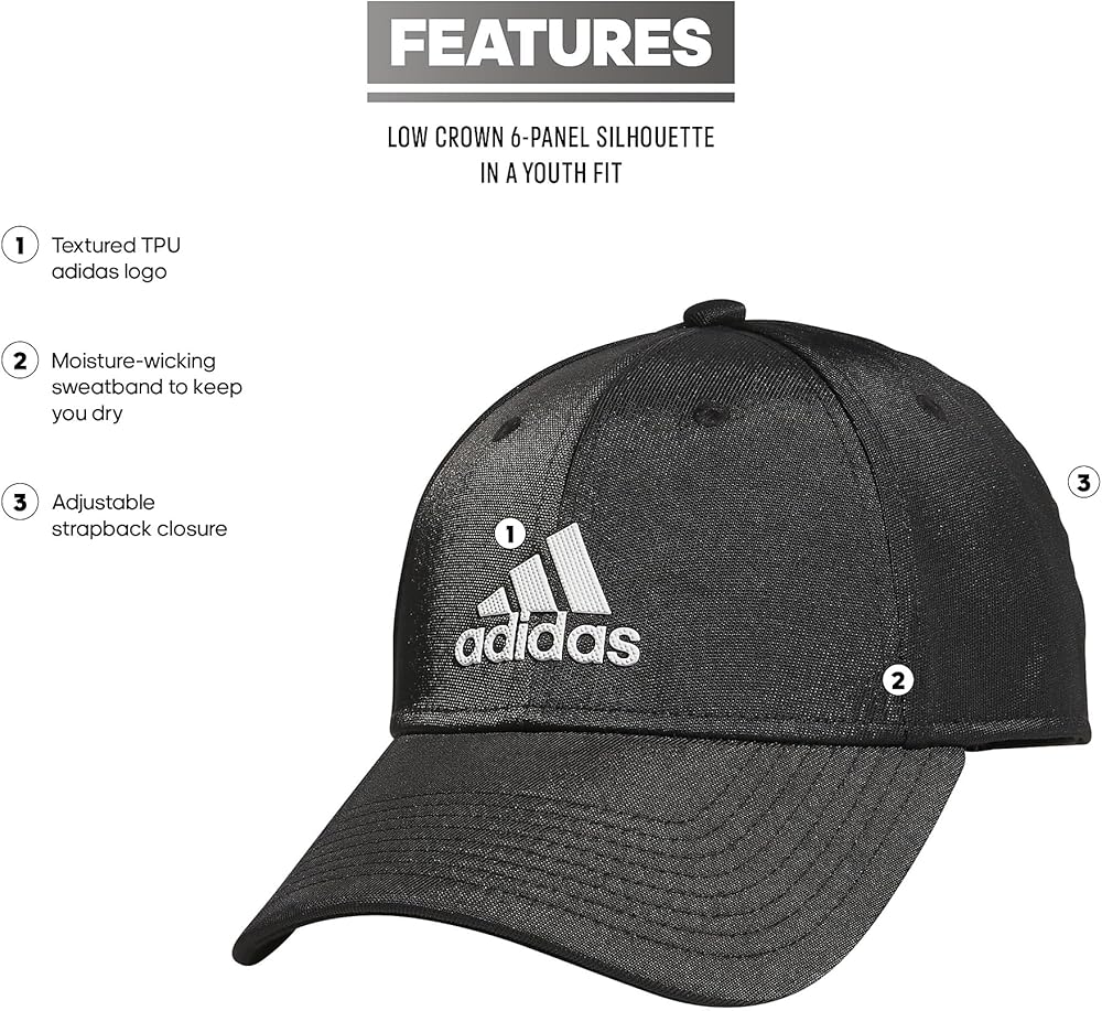 Low crown 6-panel silhouette in a youth fit. Moisture-wicking sweatband to keep you dry. Textured TPU adidas logo. Adjustable strapback closure.