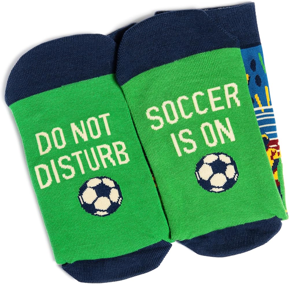 Sweet socks for soccer fans: Fun socks that soccer fans love, sporting a colorful illustration of a match, featuring a penalty kick and a stadium full of fans -plus a funny hidden message that anyone who watches soccer can relate to: “Do Not Disturb, Soccer Is On”!