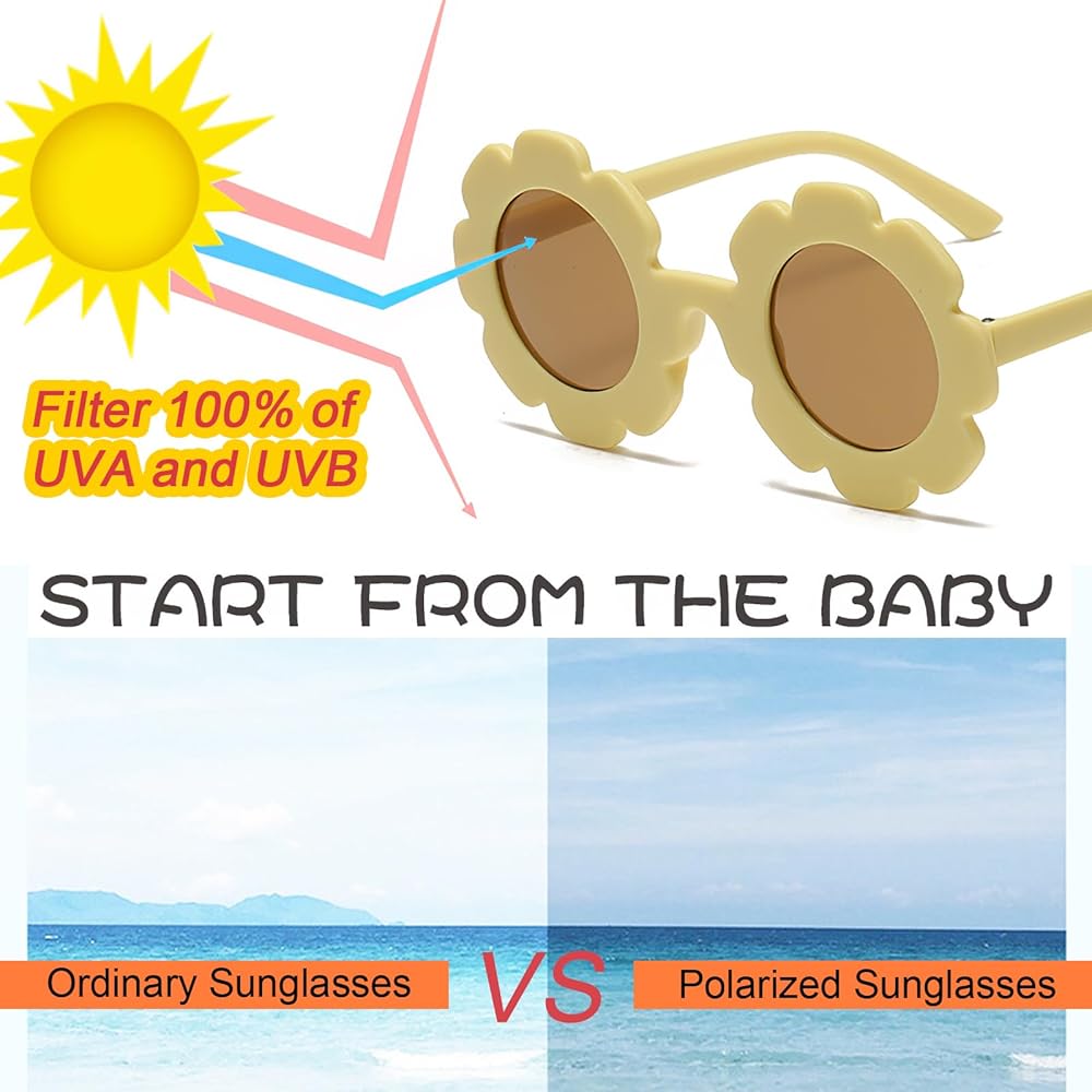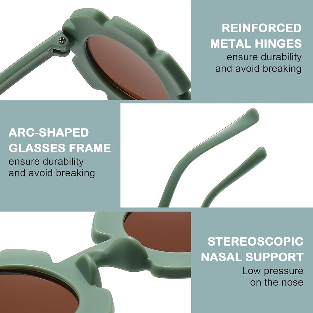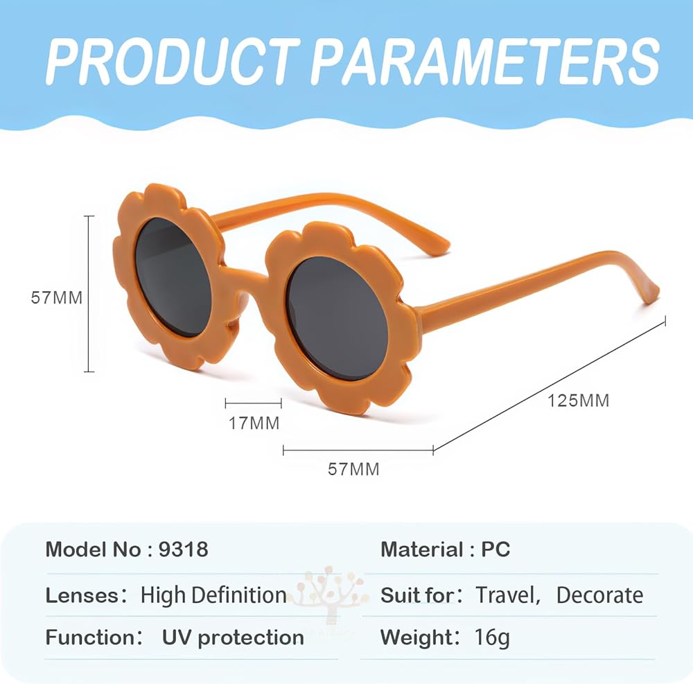 Comfortable to Wear - The weigh of flower sunglasses is only 0.8oz, easy to clean and carry. Total width of the round flower sunglasses are approx. 4.9 inches, the frame width and height are both 2.3 inches, the nose width is 0.8 inch and the leg length is 4.9 inches, suitable for kids over 3 years old.
