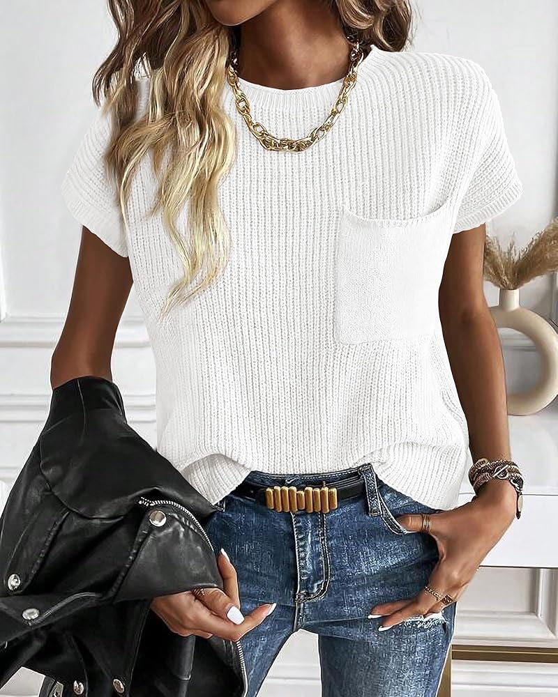 Cotton Womens Sweater Top: The Casual Sweater Vest Is Designed With a Cozy Lightweight Cotton Stretchy Ribbed Knit That Provides Optimal Breathability And Comfort During The Spring, Summer, And Fall. The Lightweight Short Sleeve Sweater Is Perfect For Layering Or Wearing Alone. With a Functional Front Pocket.