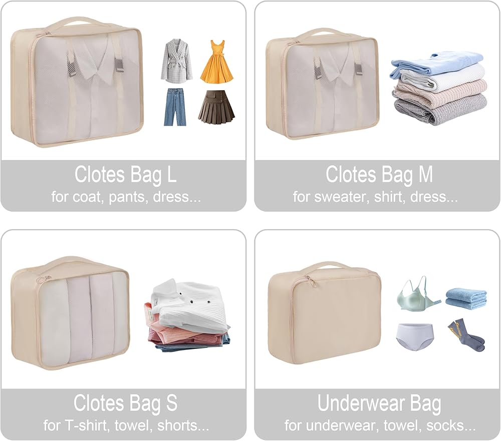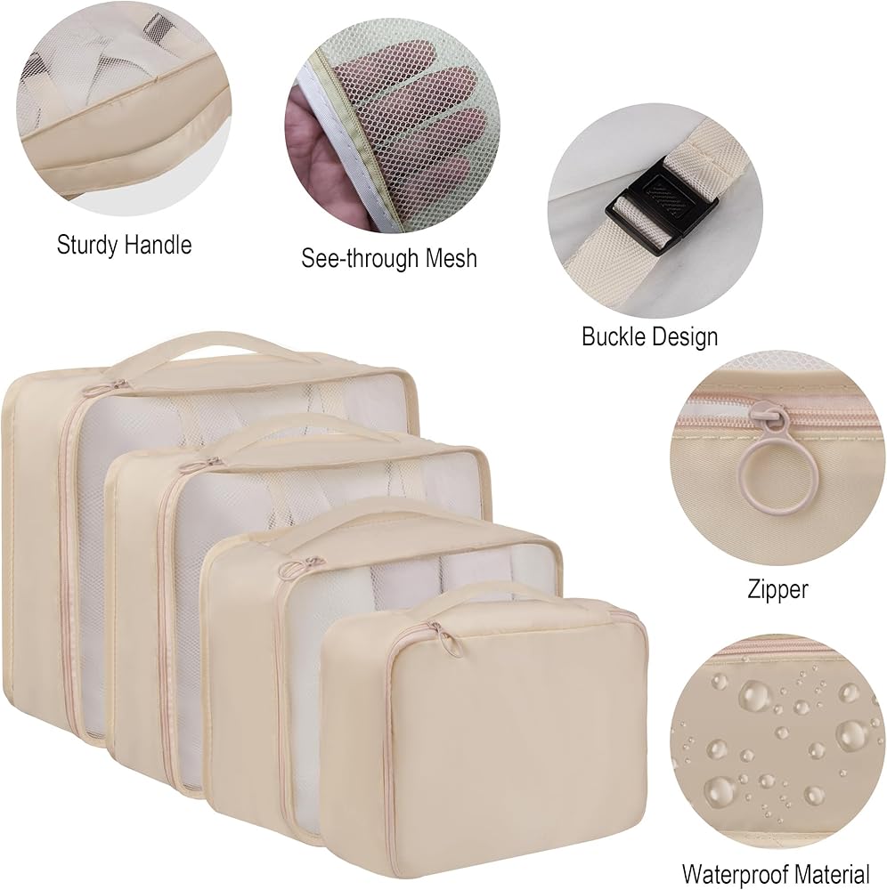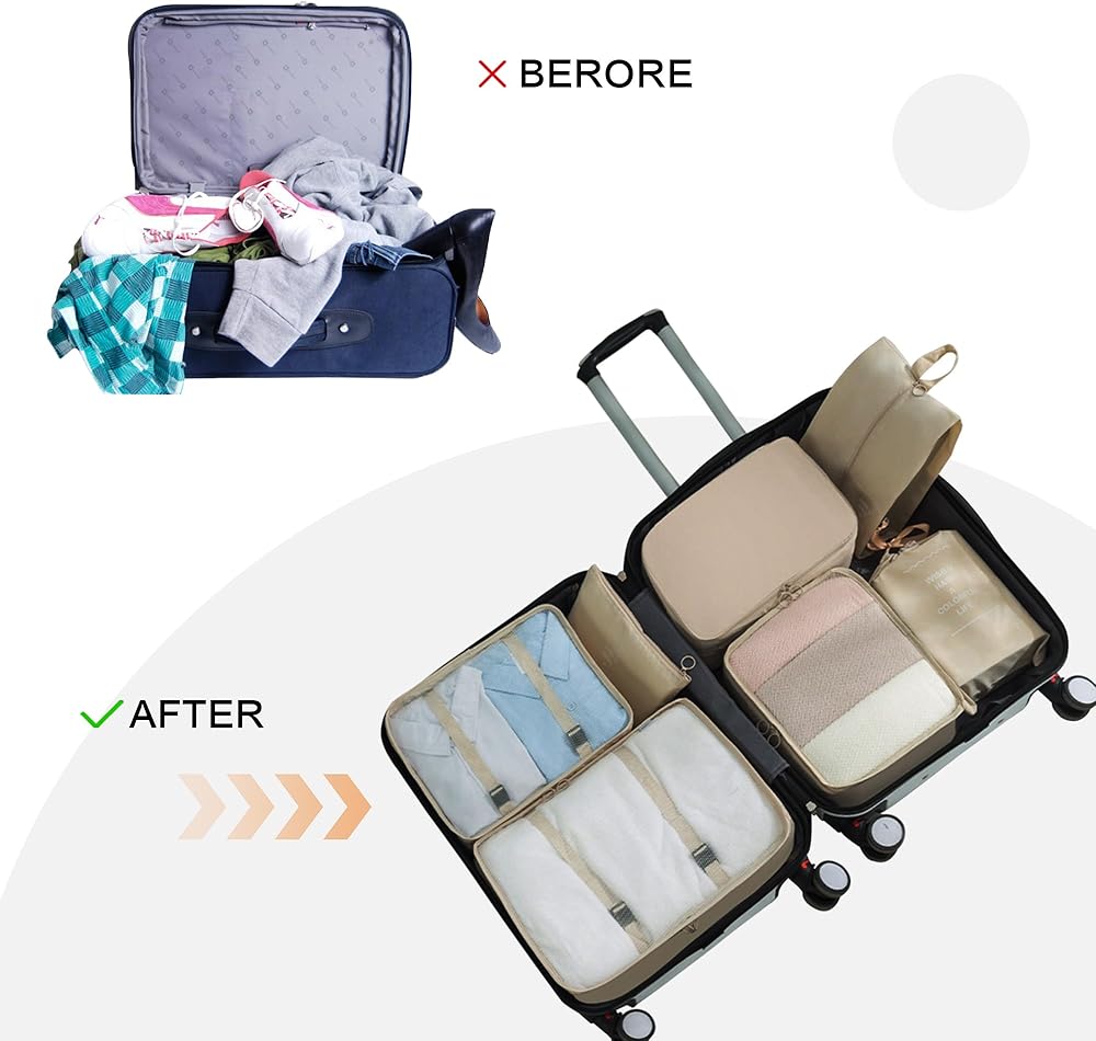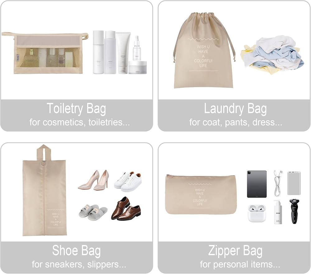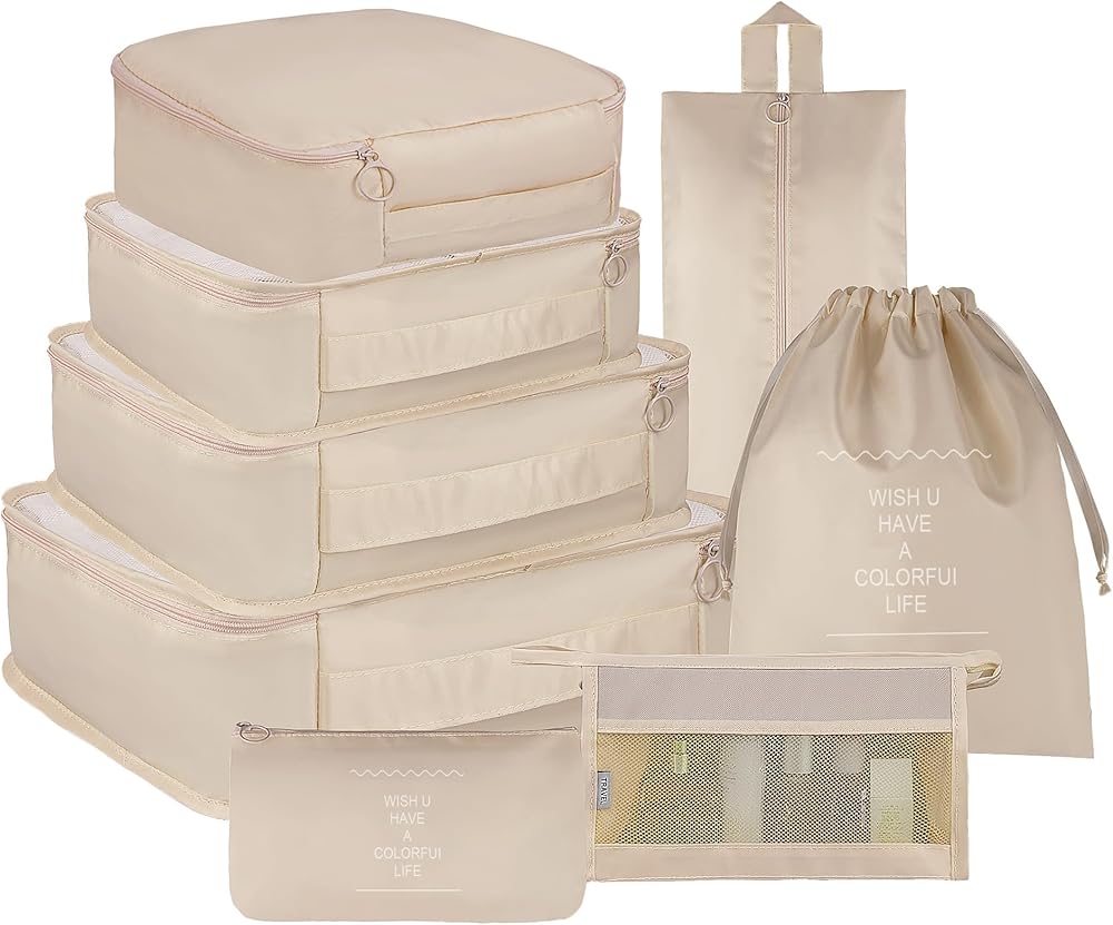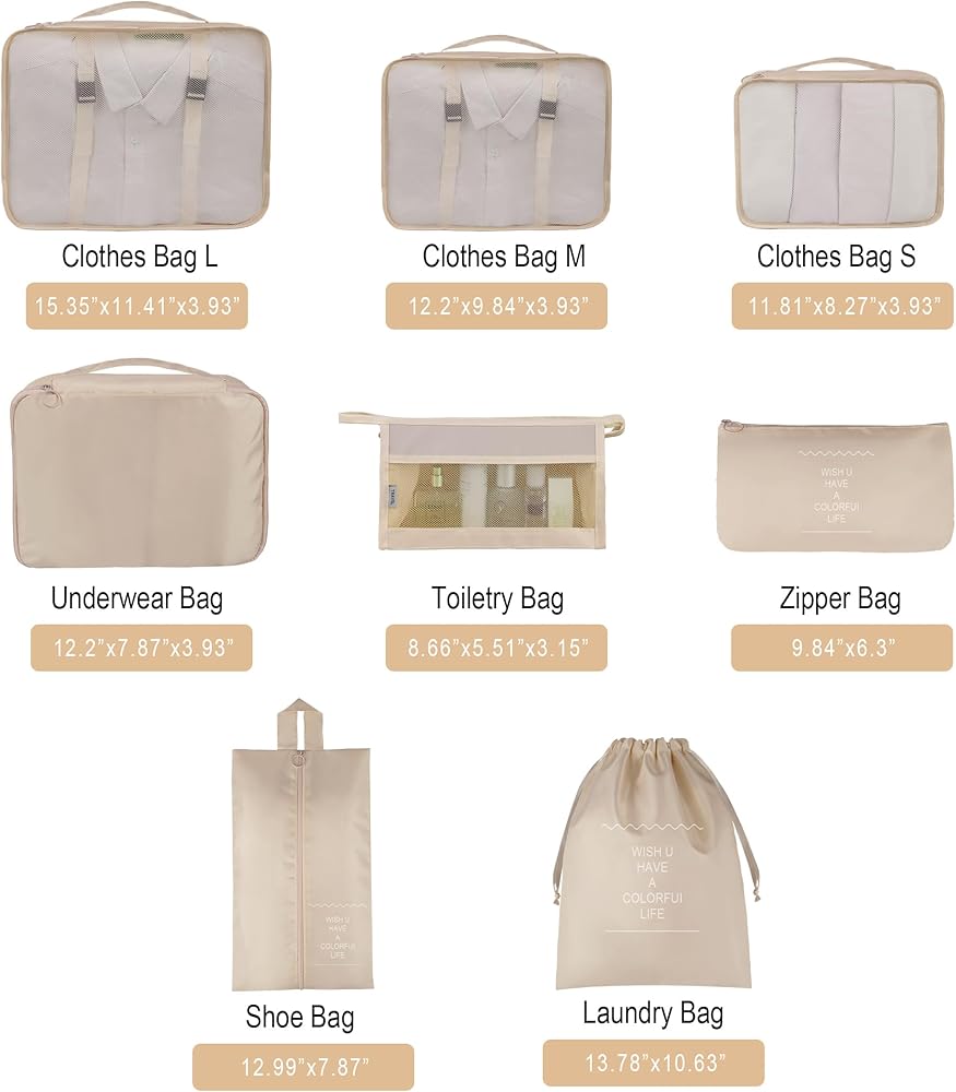 8 set of travel packing organizers, 3 mesh packing cubes, 1 secret packing cube, 1 Laundry Bag ,Shoe bag, 1 toiletry bag, 1 flat pocket,Great for organizing travel carry-on items