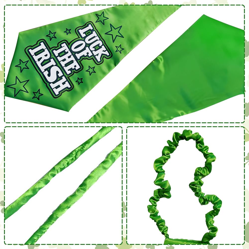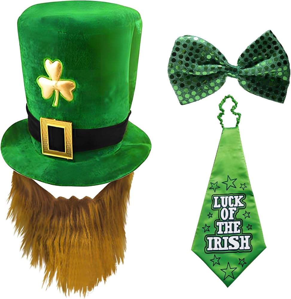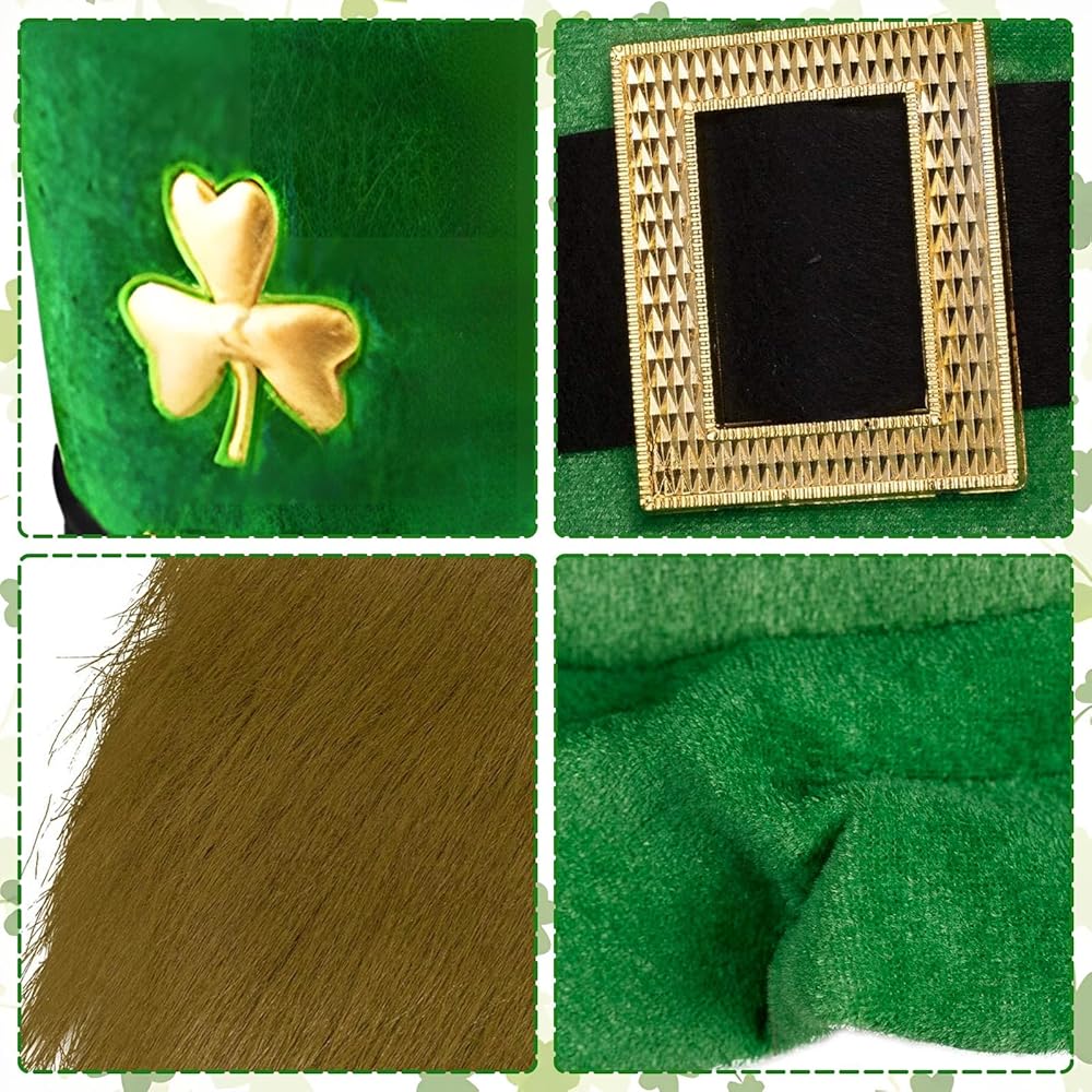 • 🍀St. Pattys Day Accessories Set: You will receive 1*green shamrock top hat, 1*bow ties, 1*neckties, 3pcs hat accessories set will let you to be a leprechaun on Saint Patrick's Day to have fun.