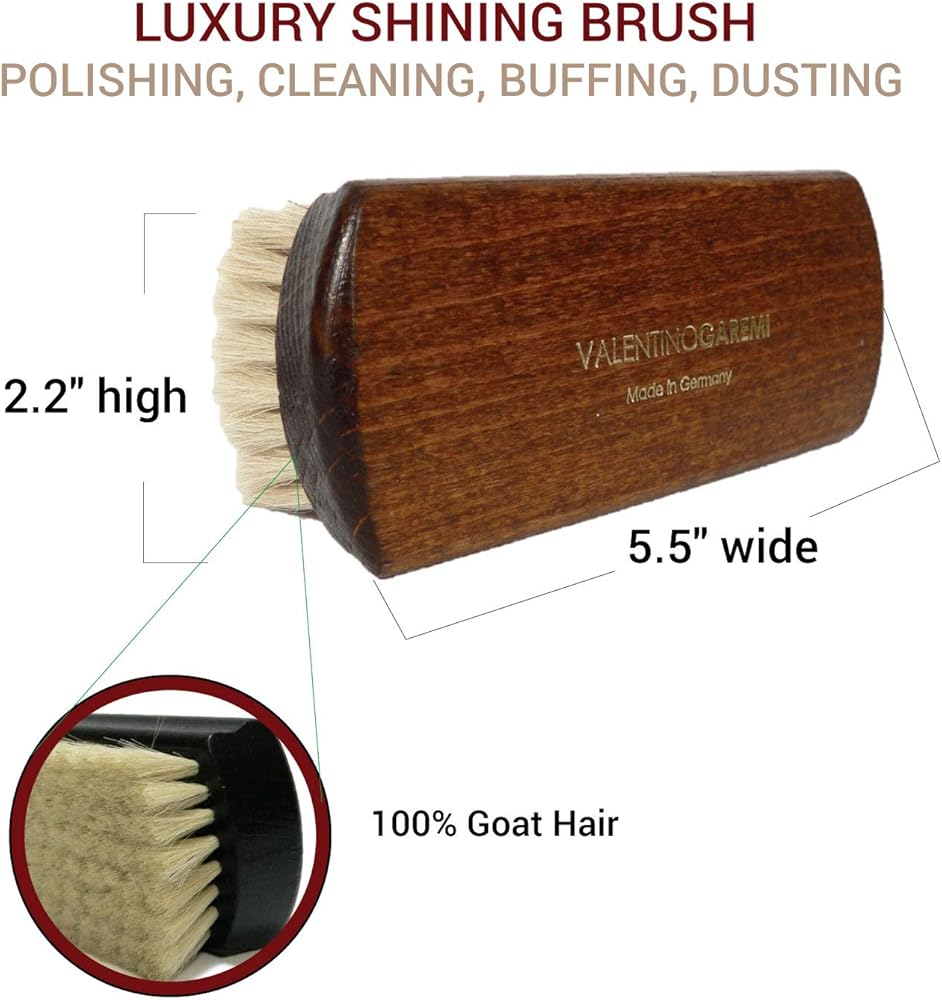 ⚜️PURE GOAT HAIR BRISTLES ON A VARNISHED HARDWOOD HANDLE: Valentino Garemi's shoe shining brush is crafted using high quality white goat hair and a strong varnished hardwood, capable of delivering excellent results. This medium sized brush measures to be 5.6” X 2.2”, and is designed to fit any sized hand, while still providing the user with a firm grip of the tool. This product allows clients to not only restore shine in their leather shoes, but also polish in products or buff away any imperfections on the surface.