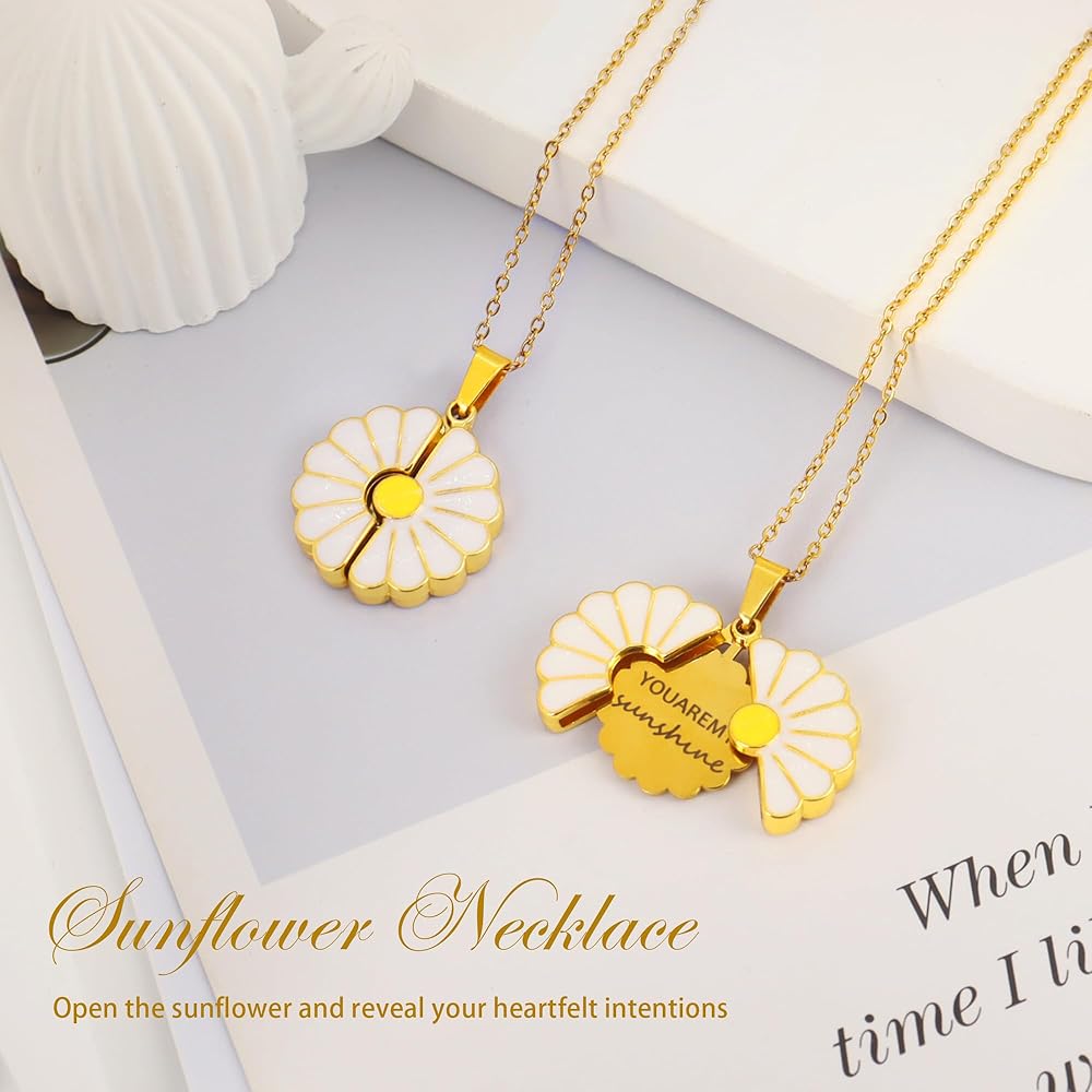 Share your heartfelt emotions with this incredible Heartfelt Sunflower Locket Necklace. Its stunning sunflower pendant opens up, revealing an engraved message that says, "You are my sunshine." It's the perfect gift for your loved ones, warming their hearts with this hidden sentiment. ❤️