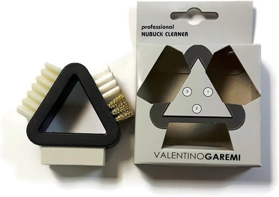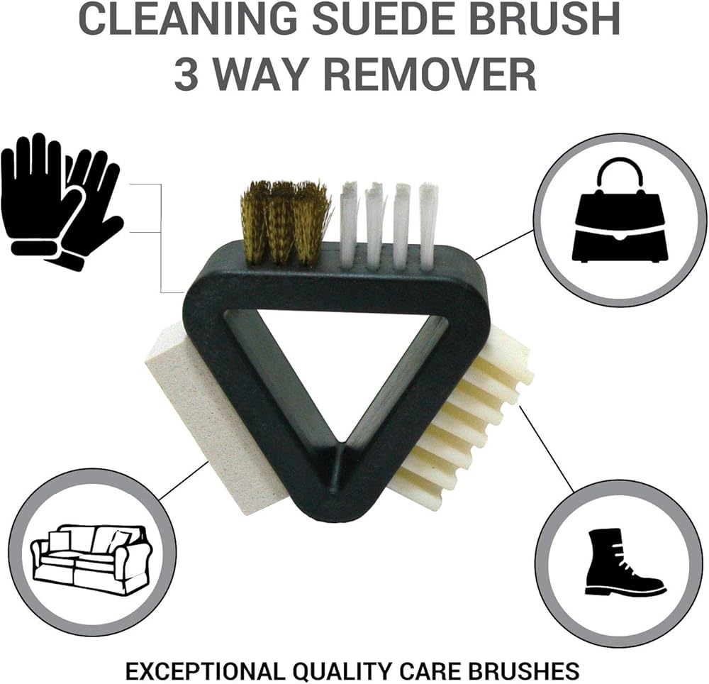 ⚜️CRAFTED TO BE HANDY AND COMFORTABLE- This three-way remover, which measured 1 inch high by 2 inches wide, a must have for owners of suede articles. Made ingeniously into a triangular shape to contain 3 tools into 1. Made in Germany, this handy tool is small enough to be stored in laptop bags, purses, and even inside jacket pockets for quick, on-the-go stain, dirt, snow slush and grease removal. This unique toll contains a stain absorbent, a mixed nylon and brass bristle brush and a crepe rubb