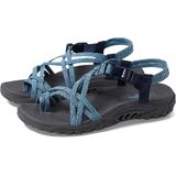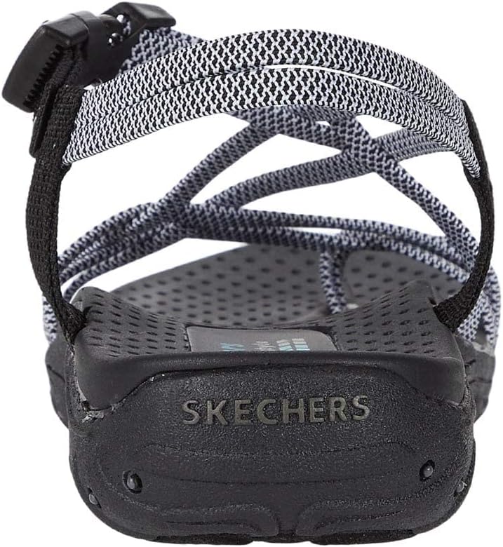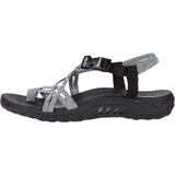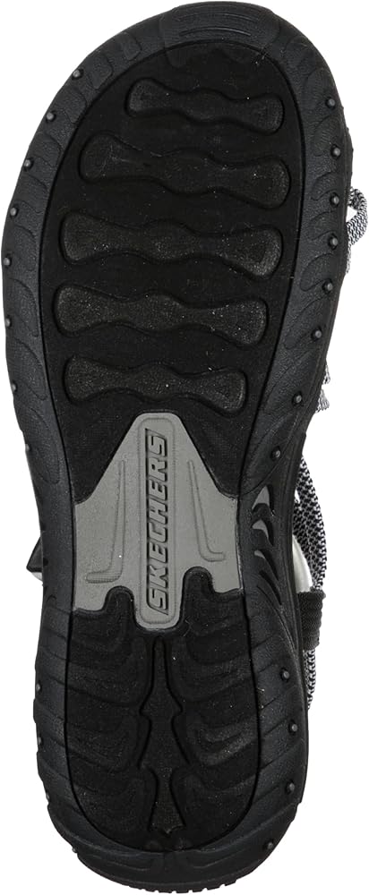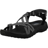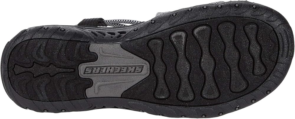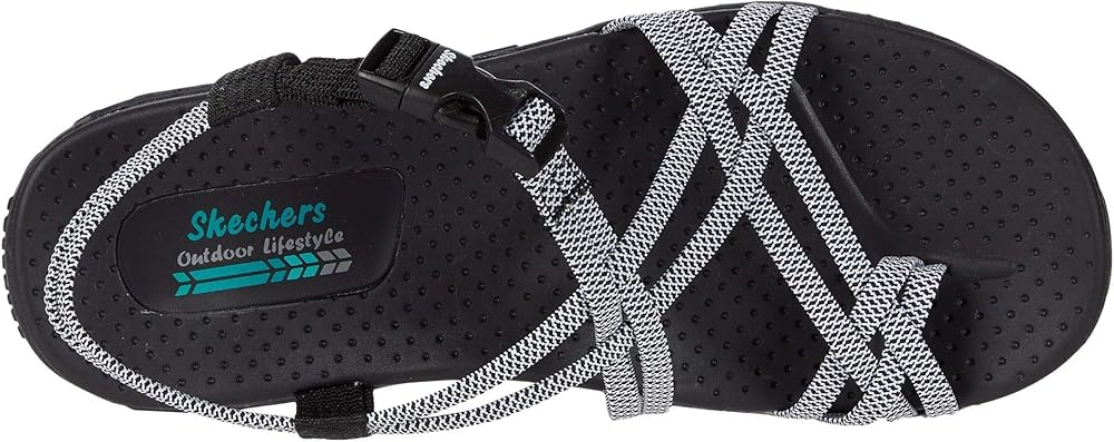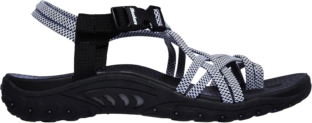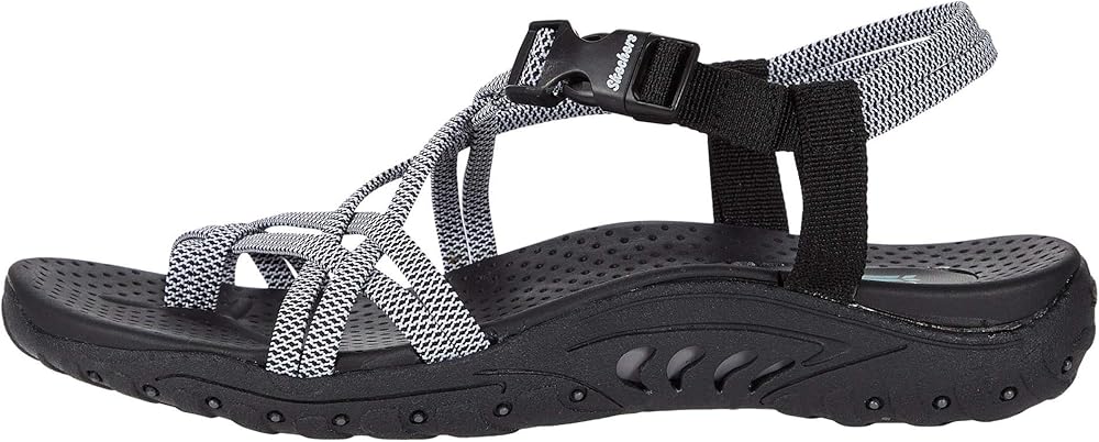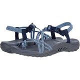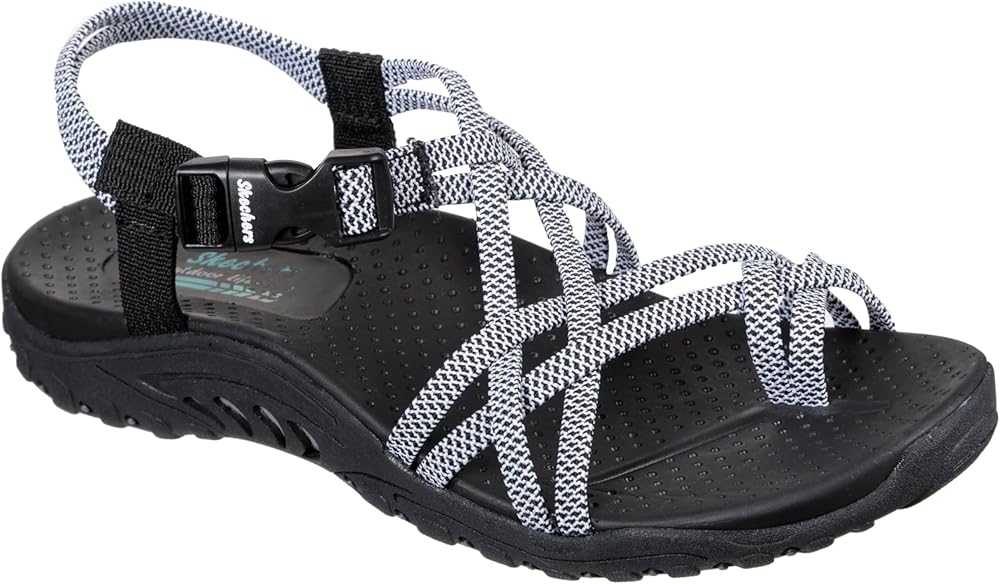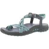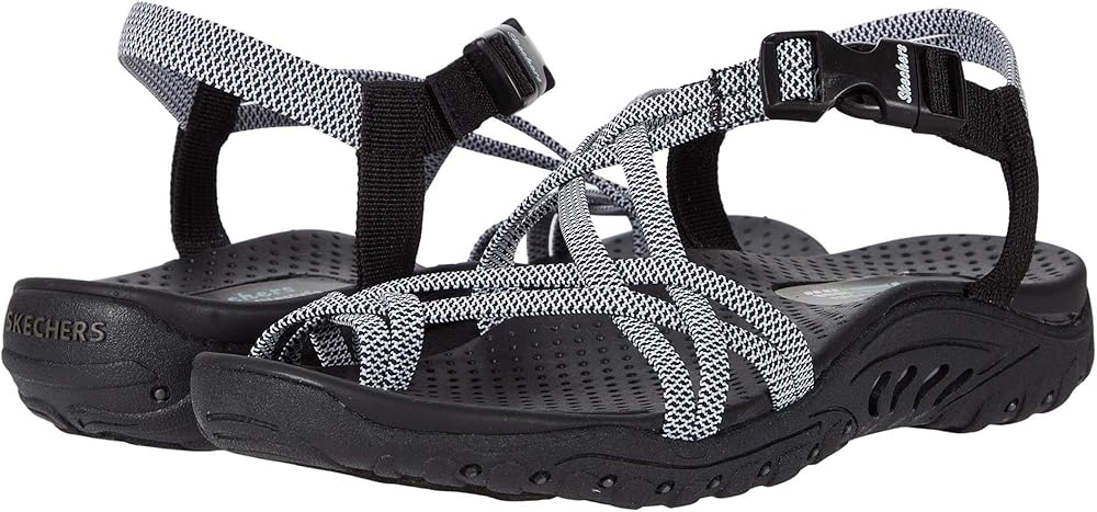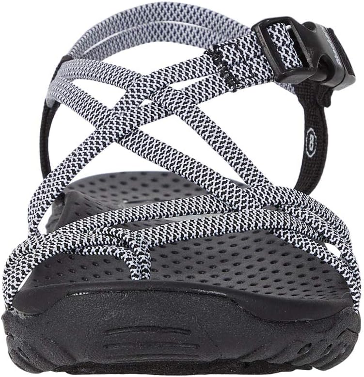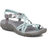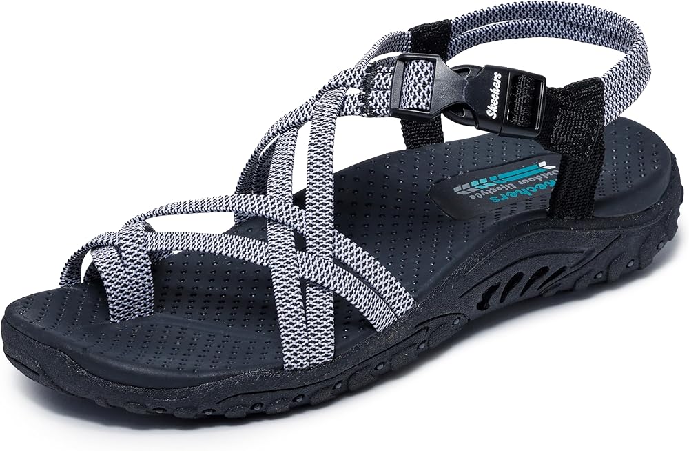 Soft web fabric upper in a strappy river style sandal with stitching accents, quick closure and supportive comfort midsole.