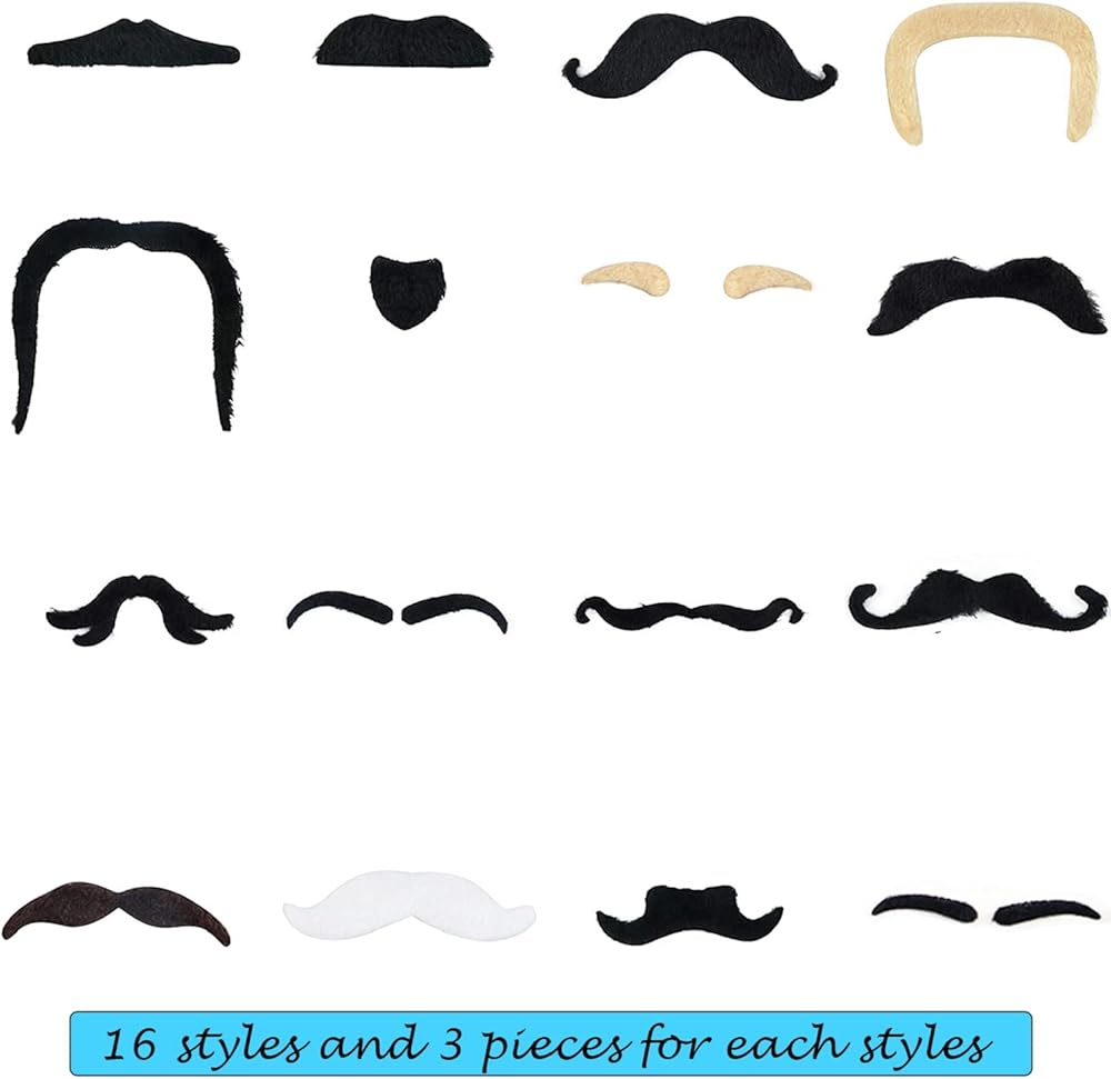 Novelty Artificial Mustaches: The adhesive beards set has 16 different styles, 3 for each style, 48 pieces in total; suitable for your various occasions dress up. Enough quantity to meet all your decoration needs.