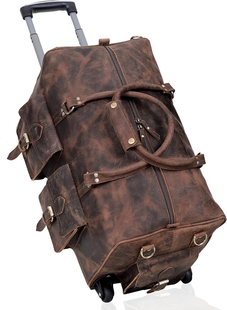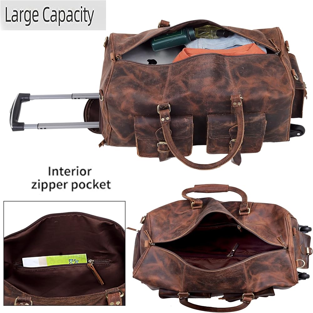 Elevate your travel with our premium Men's Leather Duffel Bag. This 21-inch rolling travel duffel is crafted from high-quality leather, offering a stylish and durable luggage solution. It's designed to make your journeys effortless, serving as the perfect versatile travel companion for weekend getaways or business trips. Featuring wheels for easy mobility and multiple pockets for organization, this wheeled brown duffel effortlessly combines practicality with timeless sophistication. Whether you're embarking on a weekend adventure or a business excursion, this stylish men's luggage ensures that your travel essentials are secure and always within reach. Upgrade your travel game and arrive in style with our durable leather duffel, meticulously tailored to meet the demands of modern travelers. At VC Leather, we pride ourselves on delivering exceptional quality, and our Men's Leather Duffel Bag is no exception. Experience the perfect blend of form and function, and journey with confidence.