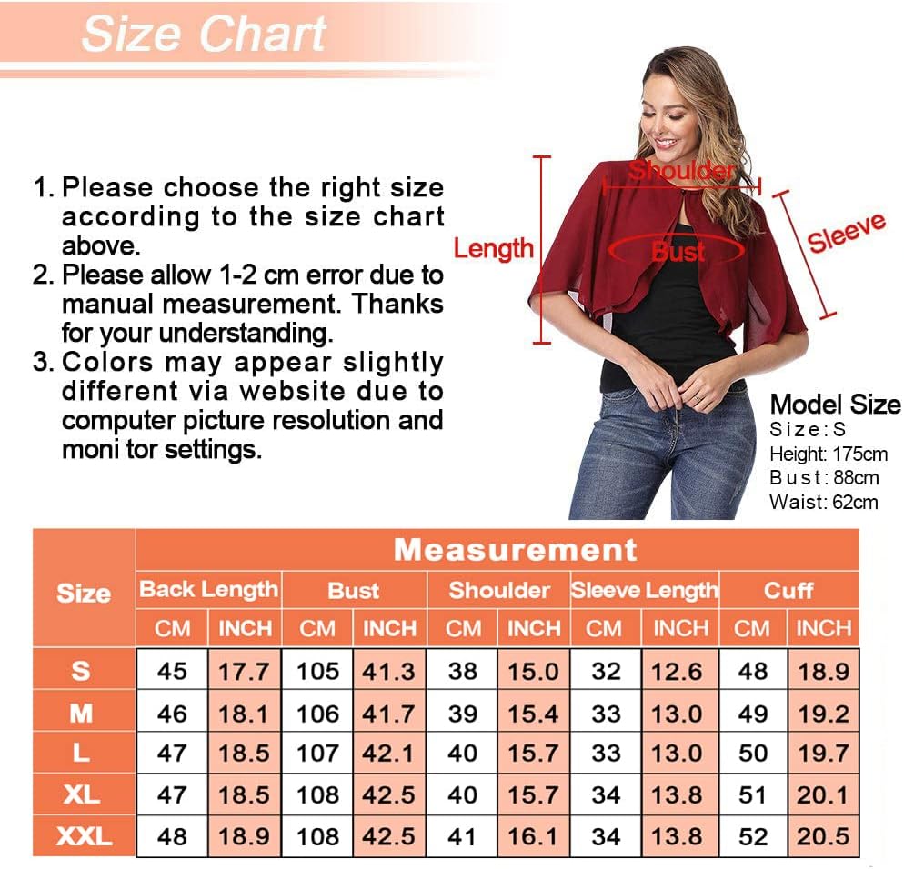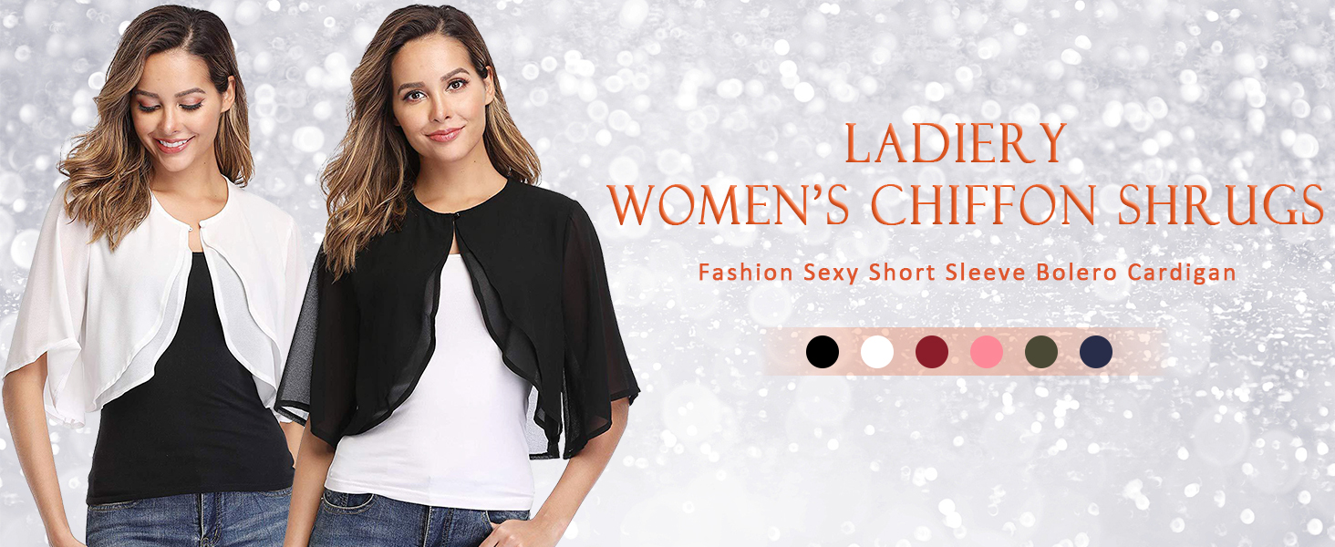 EXCELLENT FABRIC: Ladiery shrug is made of high-quality 100% chiffon fabric, which is light and comfortable, allowing you to enjoy the silky soft touch. S~XXL size are available. Whether you are petite or wearing a plus size, you can find a clothing that's best for you from the size chart we offer.