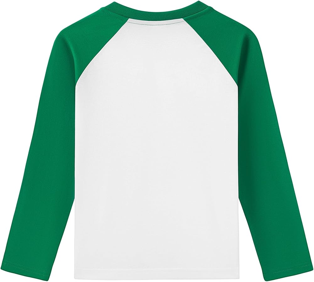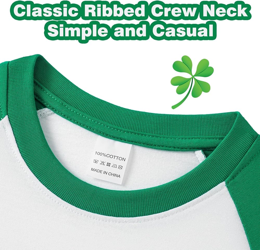 Trendy Design of kids st patricks day shirt: fashionable raglan sleeve design; Featuring a white body with contrasting green sleeves and a festive St. Patrick's Day print on the chest, exudes an abundance of festive flair