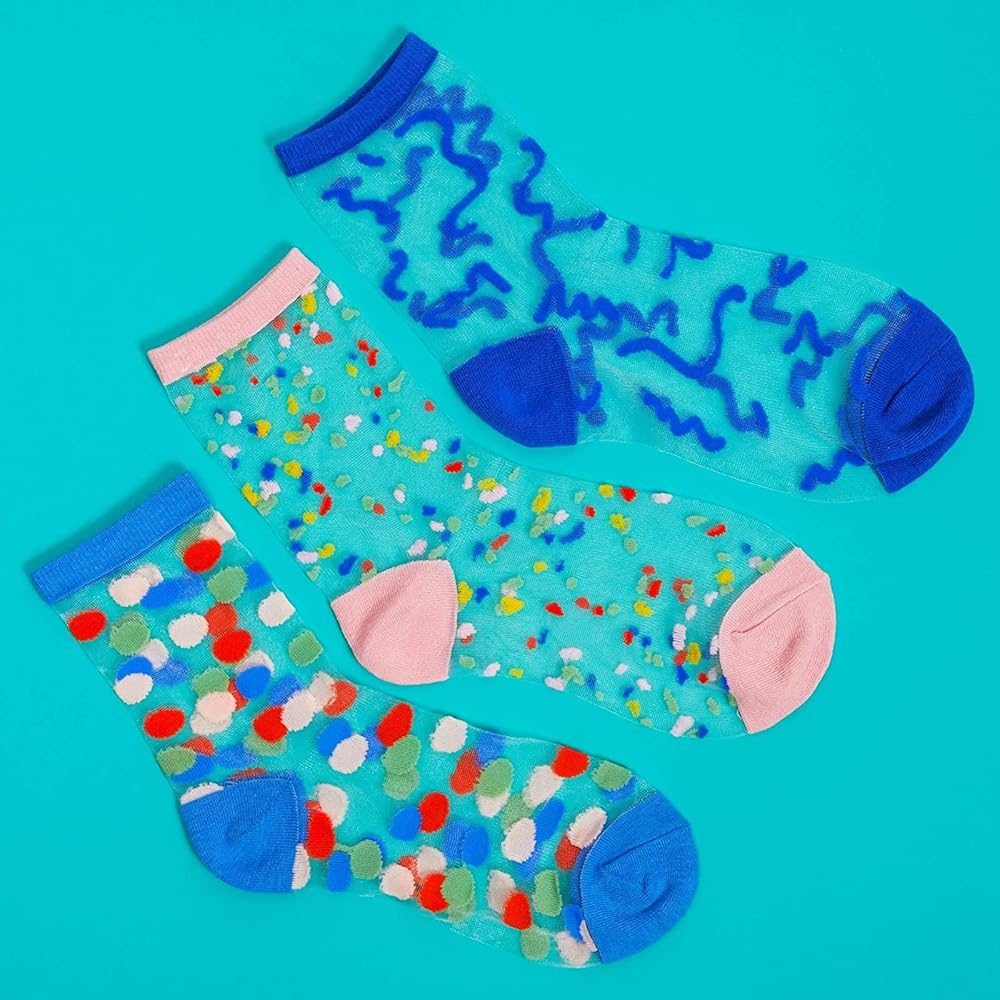 Ankle Stockings for Women: Includes 3 pairs of sheer ankle socks in pink, light blue, and blue with confetti embellishments that are cute and elegant and can match with most styles