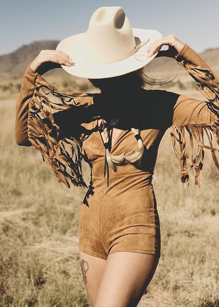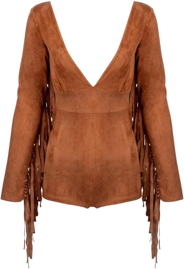 Get ready to turn heads and steal the spotlight with this brown fringe romper! This bohemian-inspired masterpiece is designed to make you feel like a true festival fashionista or a city-slicking trendsetter, no matter where you wear it.