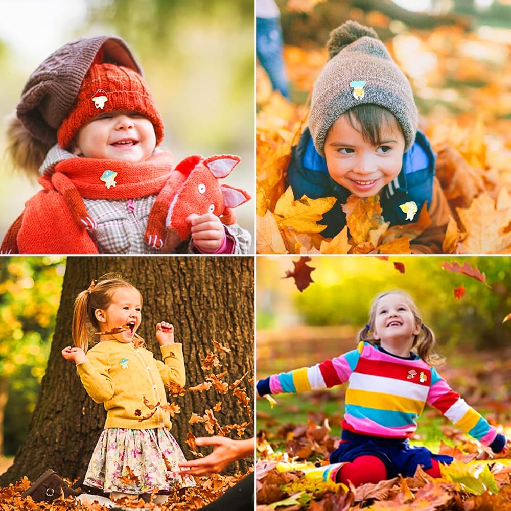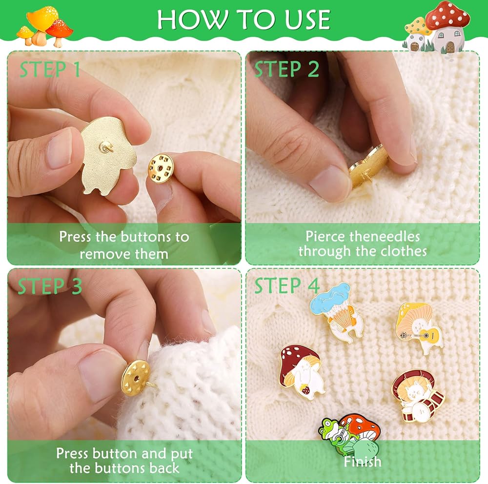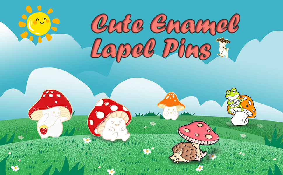 Mushroom Brooch Pins Design:Cute brooches badge adopts the elements of animal and plant collocation with mushroom as the theme.New shapes make It look more special and exquisite.16 badge brooches in a package-frogs playing guitar on mushrooms,cat in a mushroom hat,yellow mushroom playing guitar,pink mushroom holding a sharp knife,blue mushroom playing the organ,red mushrooms are dancing,hedgehogs with shading under mushrooms. Kawaii's shape is unforgettable.