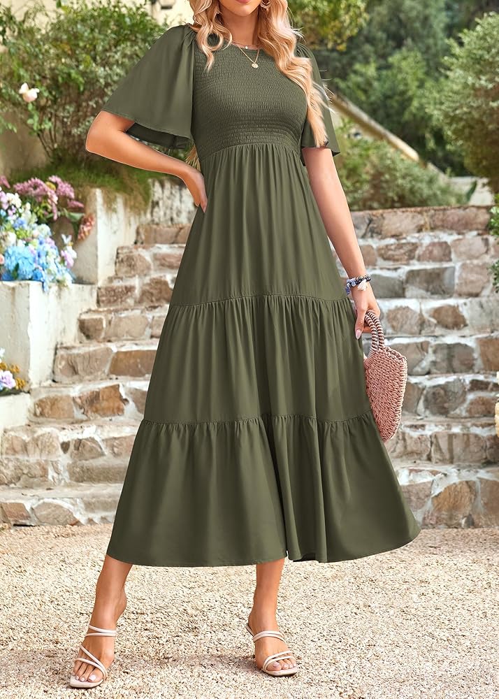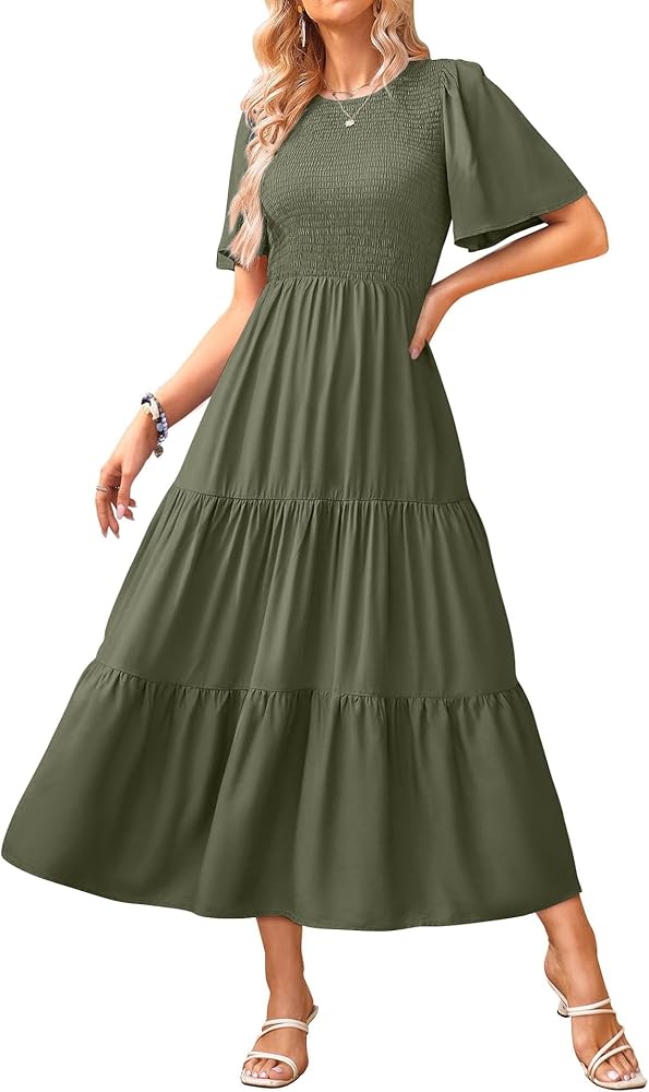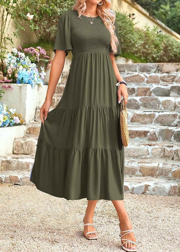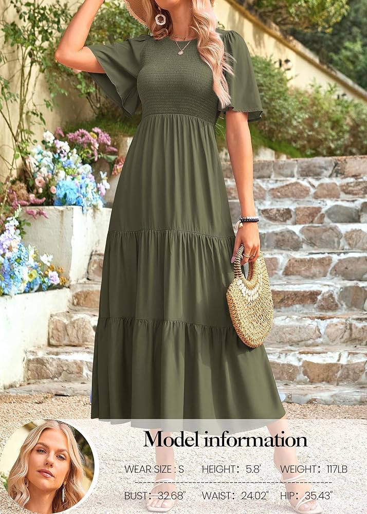 Features: S=US 4-6, M=US 8-10, L=US 12-14, XL=US 16-18, XXL=US 20. Women Dresses/ Maxi Dress/ Midi Dress/ Women's Casual Dresses/ Wedding Guest Dress/ Short Sleeve Summer Dress/ Flowy Dress/ Fit and Flare Summer Dress for Women/ Smocked High Waisted A Line Swing Dress/ Flutter Sleeve/ Ruffle Tiered Hem/ Smocked Bodice/ Solid Color/ Lightweight Soft Fabric/ With Lined.