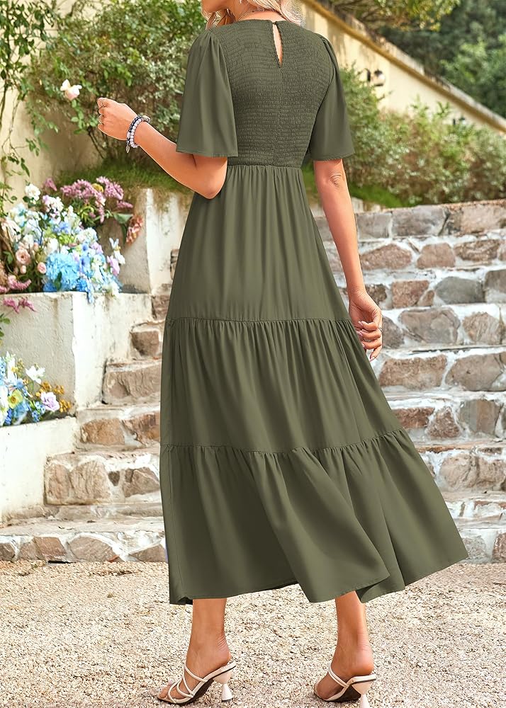 Make a Statement With This Smocked Dress Women Featuring Charming Flutter Short Sleeves That Add a Touch Of Femininity. The Exquisite Smocked Detailing Beautifully Contours Around Your Upper Body. Tiered Midi Dress-Stunning Ruffle Hem and Layers Create a Visually Appealing Cascading Effect As You Move.
