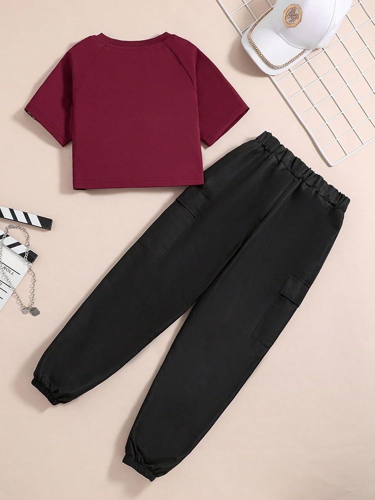 SweatyRocks Girl's Casual 2 Piece Outfit Letter Graphic Short Sleeve T Shirts and Cargo Pants Set