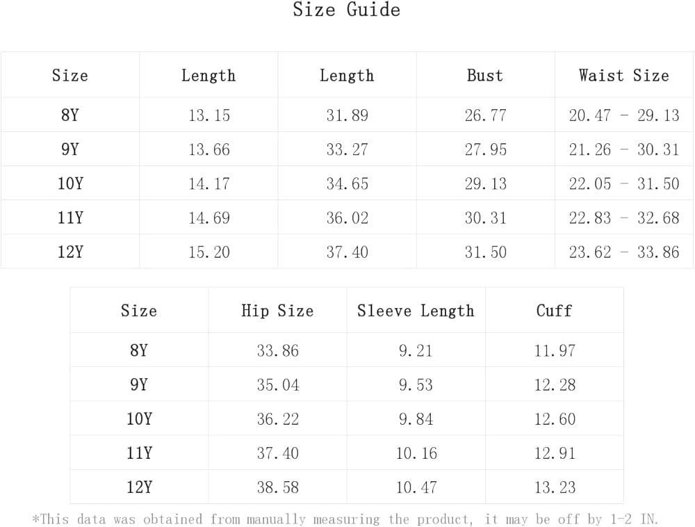 12Y:Bust:31.5IN,Cuff:13.2IN,Length:15.2IN,Sleeve Length:10.5IN,Hip Size:38.6IN,Length:37.4IN,Waist Size:23.6-33.9IN
