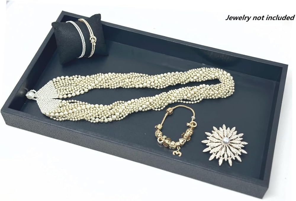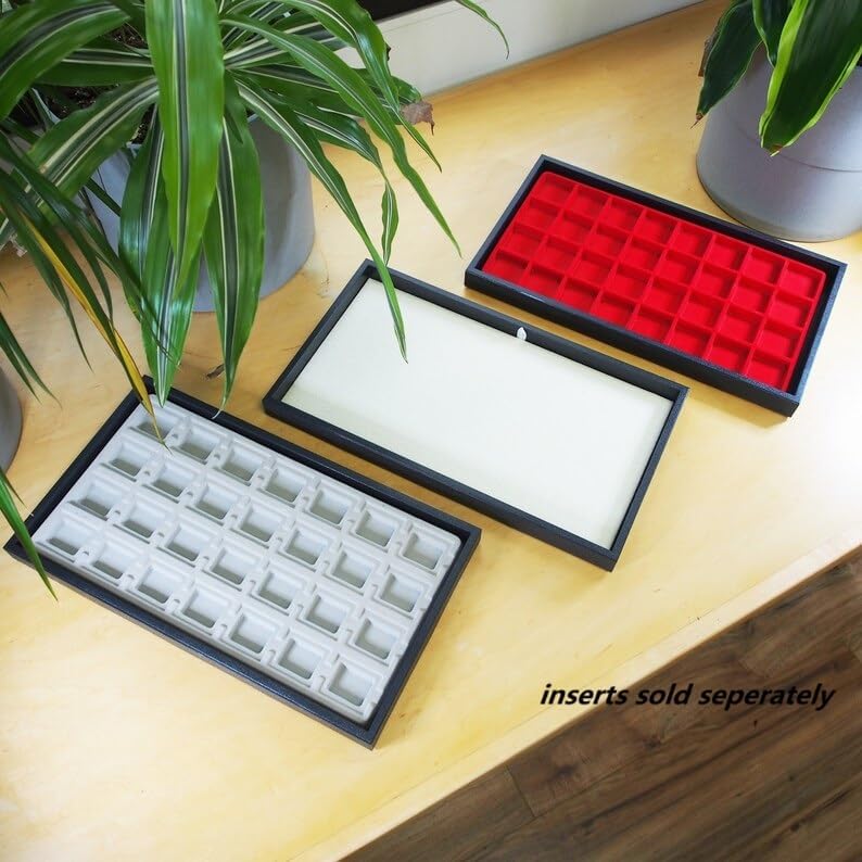 MATERIAL: Made of high-quality black plastic. It feels great to the touch and looks elegant. Ultra Lightweight Trays Perfectly fit all Standard-size Inserts and pads to Display your Rings, Necklaces, Bracelets, Watches, Pendants, and Earrings. It also can be used to organize assorted items in one place.