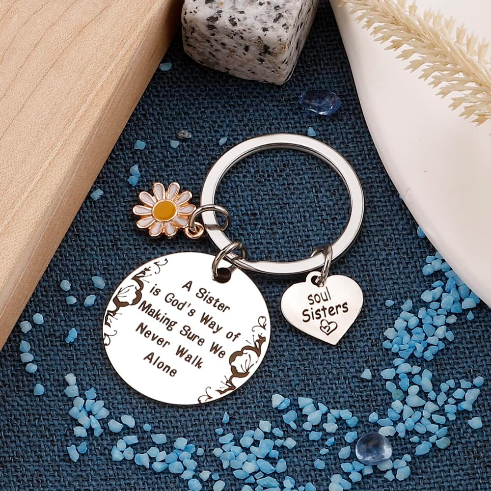 • 🎁PERFECT SISTER GIFT: Engraving"A Sister is God's Way of Making Sure We Never Walk Alone."With a small heart pendant engraved with soul sister and a small white flower pendant. You can give the keychain to your sister on sisters birthday, Women's Day. As Thanksgiving gifts, Christmas gifts,Easter gifts, Halloween gifts, Homecoming gifts,weddings gifts, graduations gift, bride bachelorette party gifts, bachelor parties gifts, anniversaries gifts to show your care, appreciation and love for them.