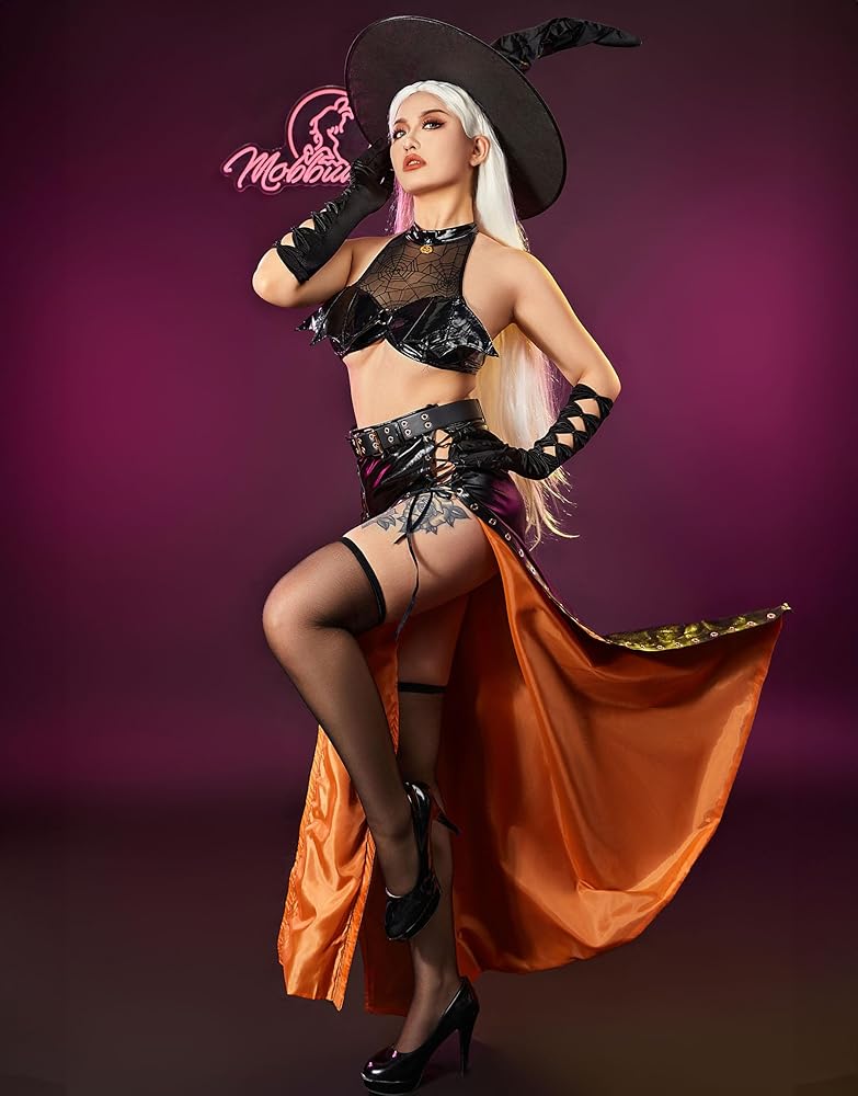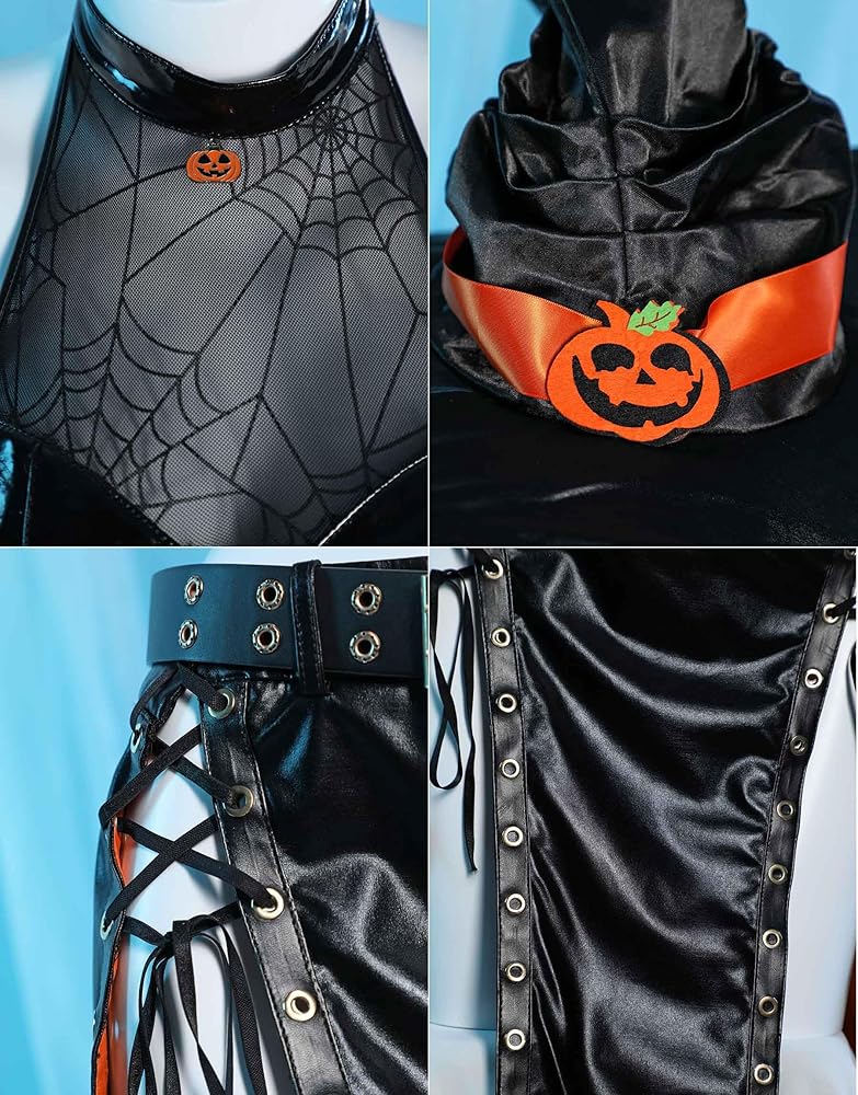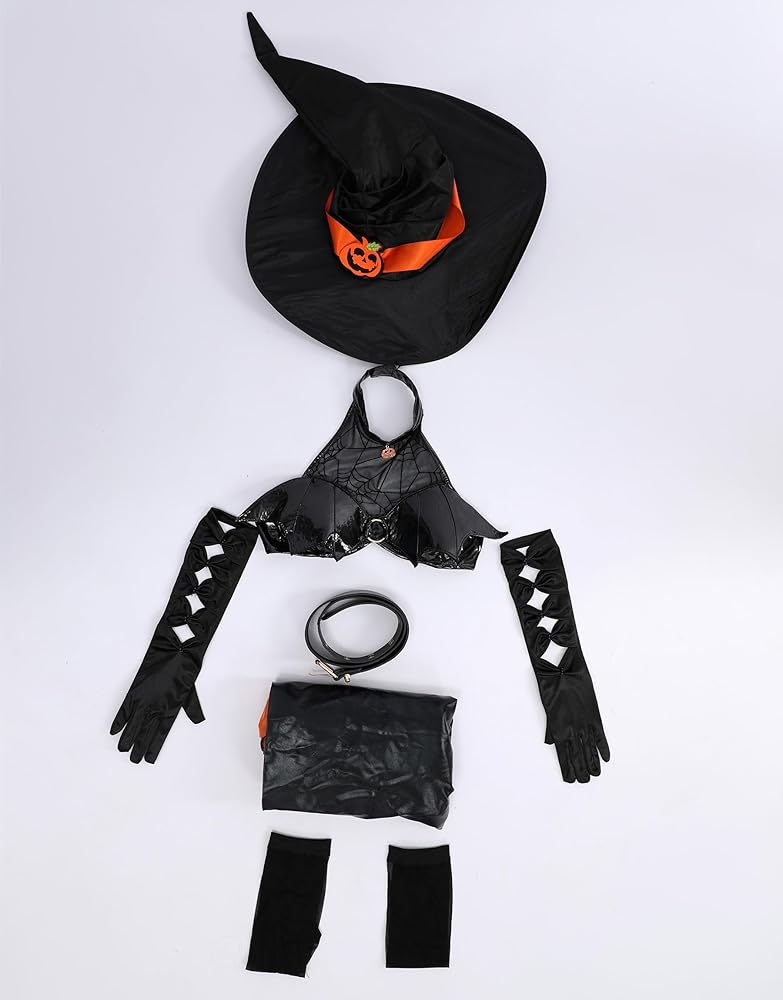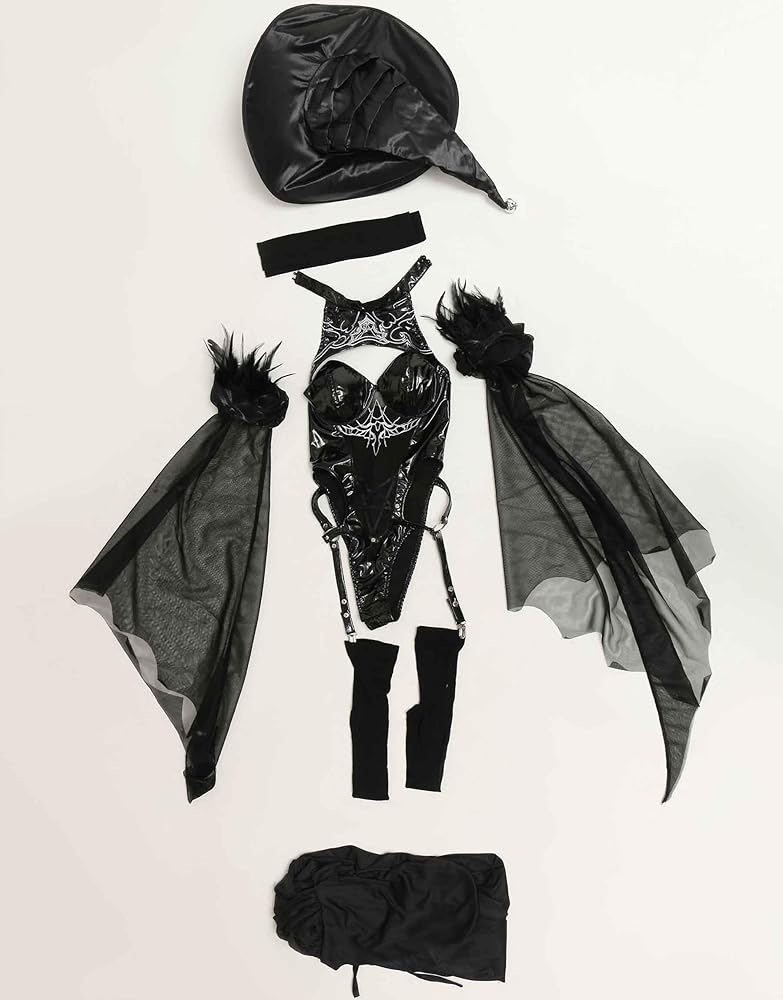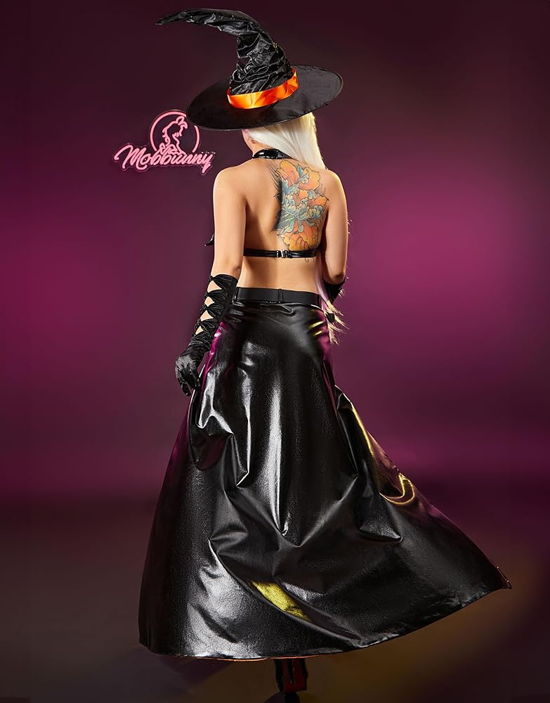 Design: Made of shiny pu leather for durability and comfortable fit. Shiny leather look, sexy halter bat wing top, classic witch pointy hat and high slit leather skirt make a perfect Halloween set.