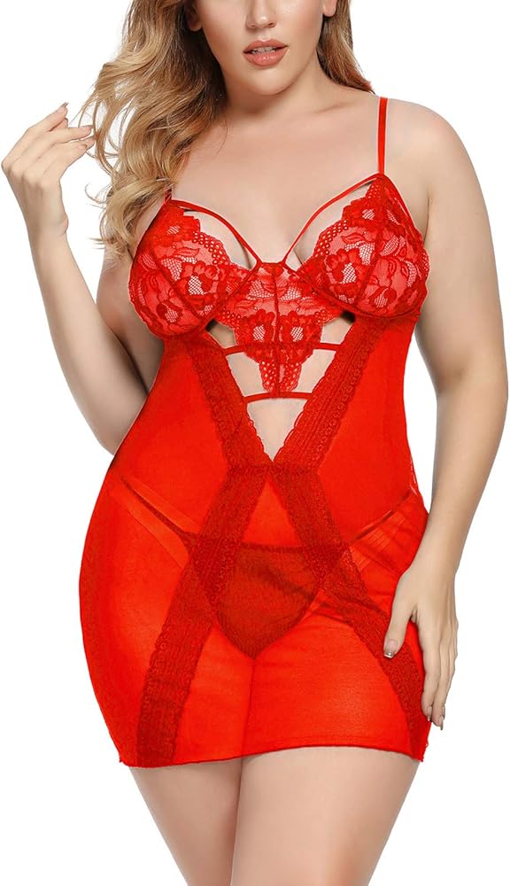 Plus size chemise features a sexy midriff cut-out with feminine lace detail.Adjustable ruffle spaghetti straps, A matching mesh panty completes this 2-piece set