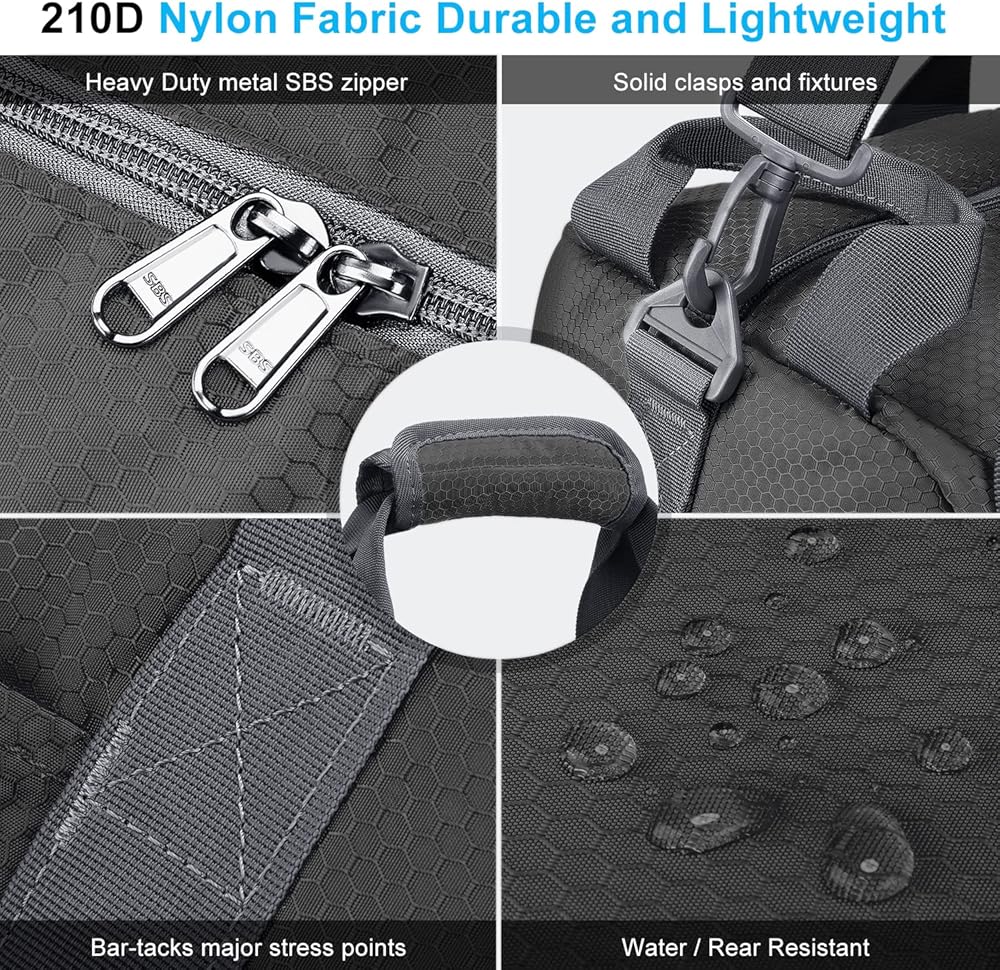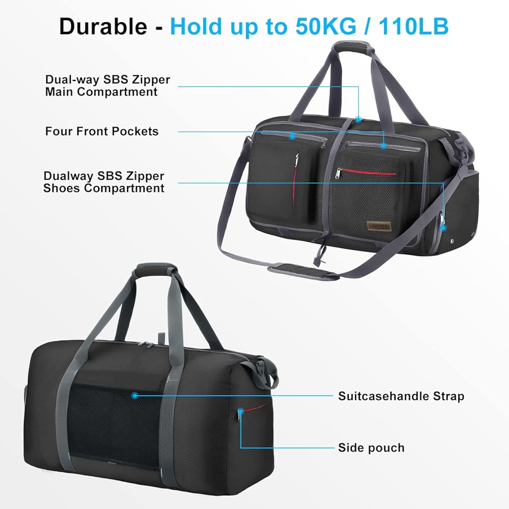 **Large Capacity 55L and 1.6 pounds(Product Dimensions (Unfolded Size): 24.4 x 12.6 x 11 inches,(Folded Size):10.6 x 9.4 x 1.9 inches, easy to store)** This folding bag has one spacious main compartment and 7 separate pockets. Made of honeycomb 600D polyester fabric, waterproof & tear-resistant,and premium metal SBS zippers and reinforced major stress points.