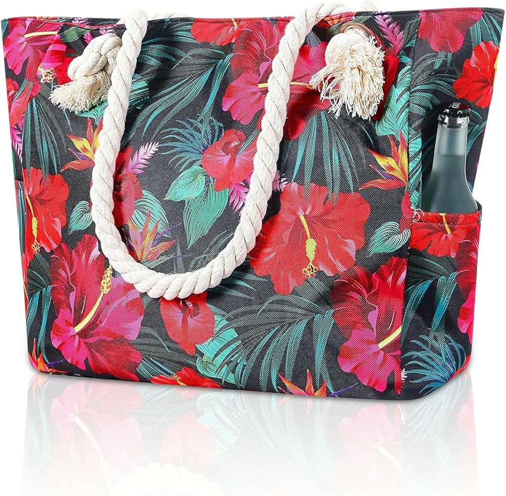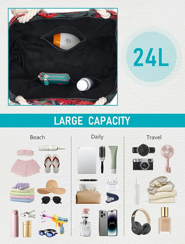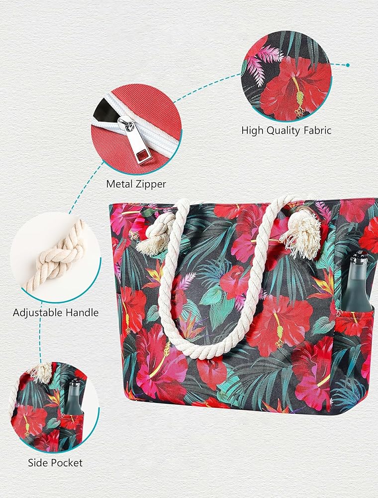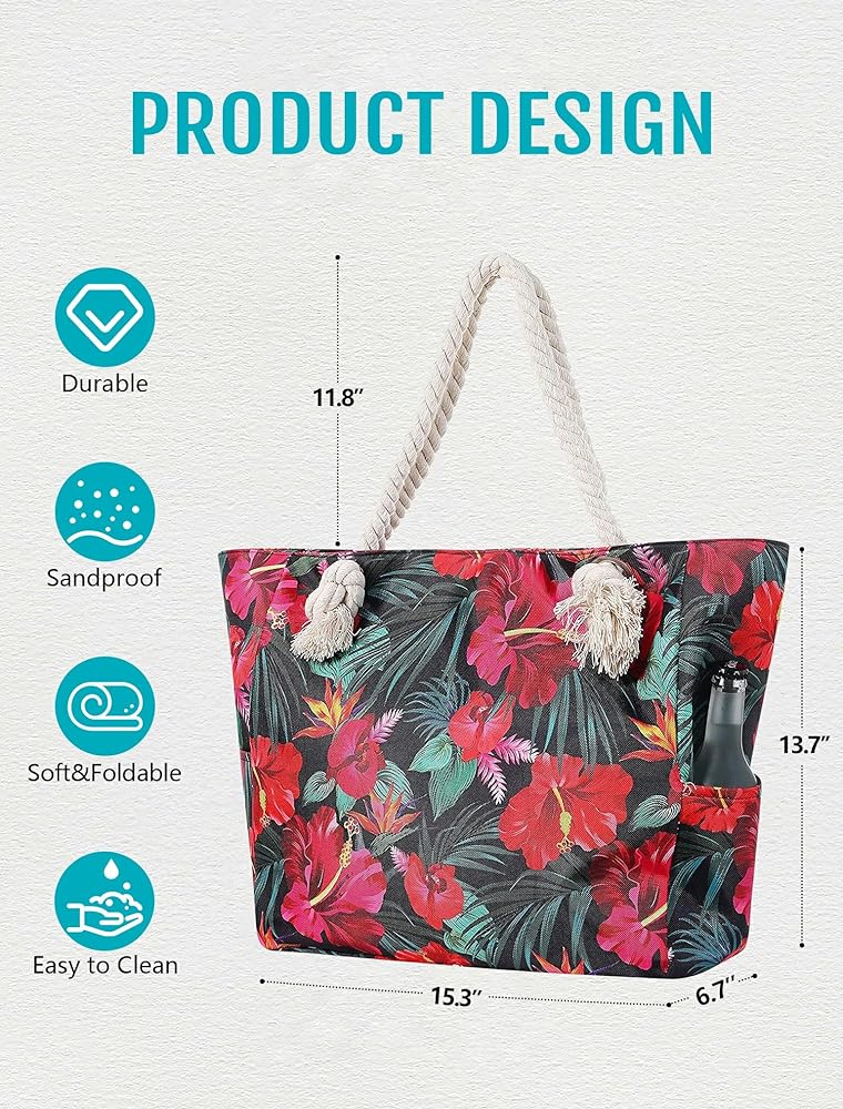 【Super capacity】 This is a beach bag with super capacity. There is enough space to safely store beach towels, suits, lotion, lipsticks, cosmetics, magazines and other accessories. There are two pockets on both sides of the beach bag, and three inner pockets (one of which has a zipper) inside, so you can place your things as you like.