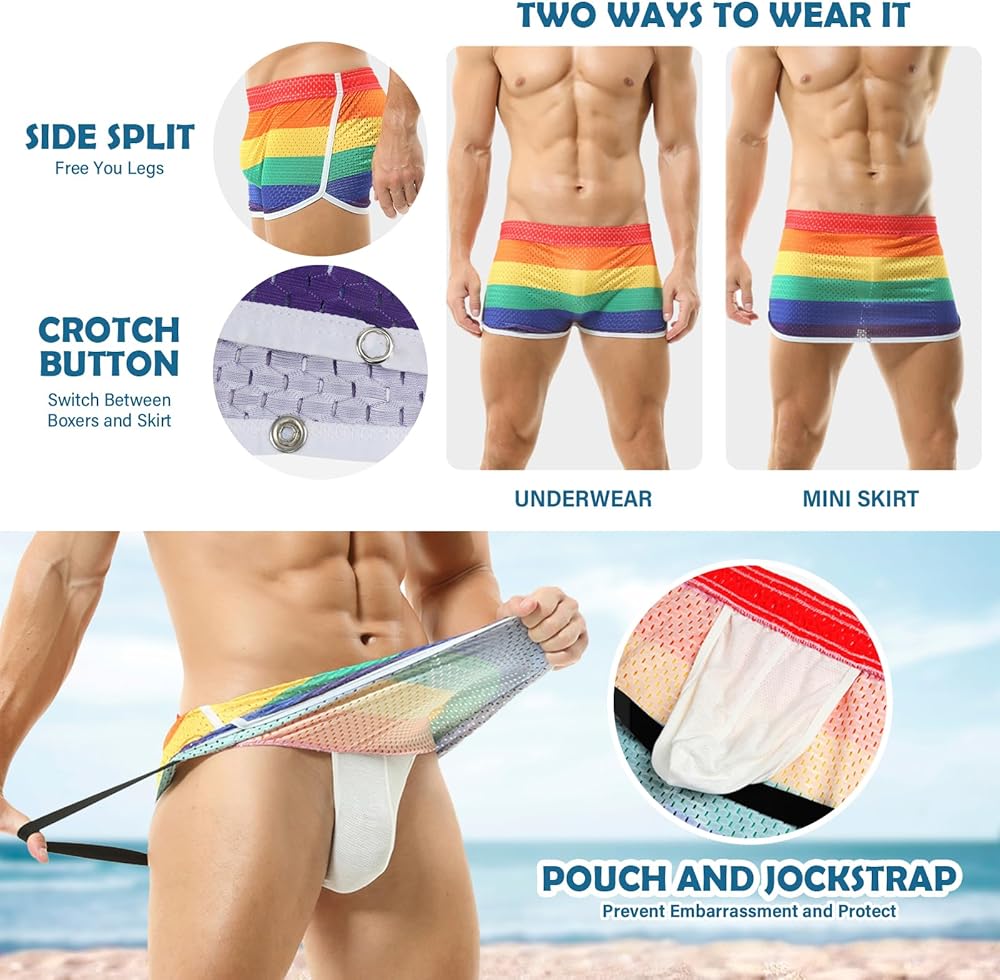Bottom Design: Mens rainbow shorts have a built-in pouch to prevent embarrassment. The crotch button design can switch between underwear and skirt. Side split to give more free space for your legs. Jockstrap plays a fixed and protective role.