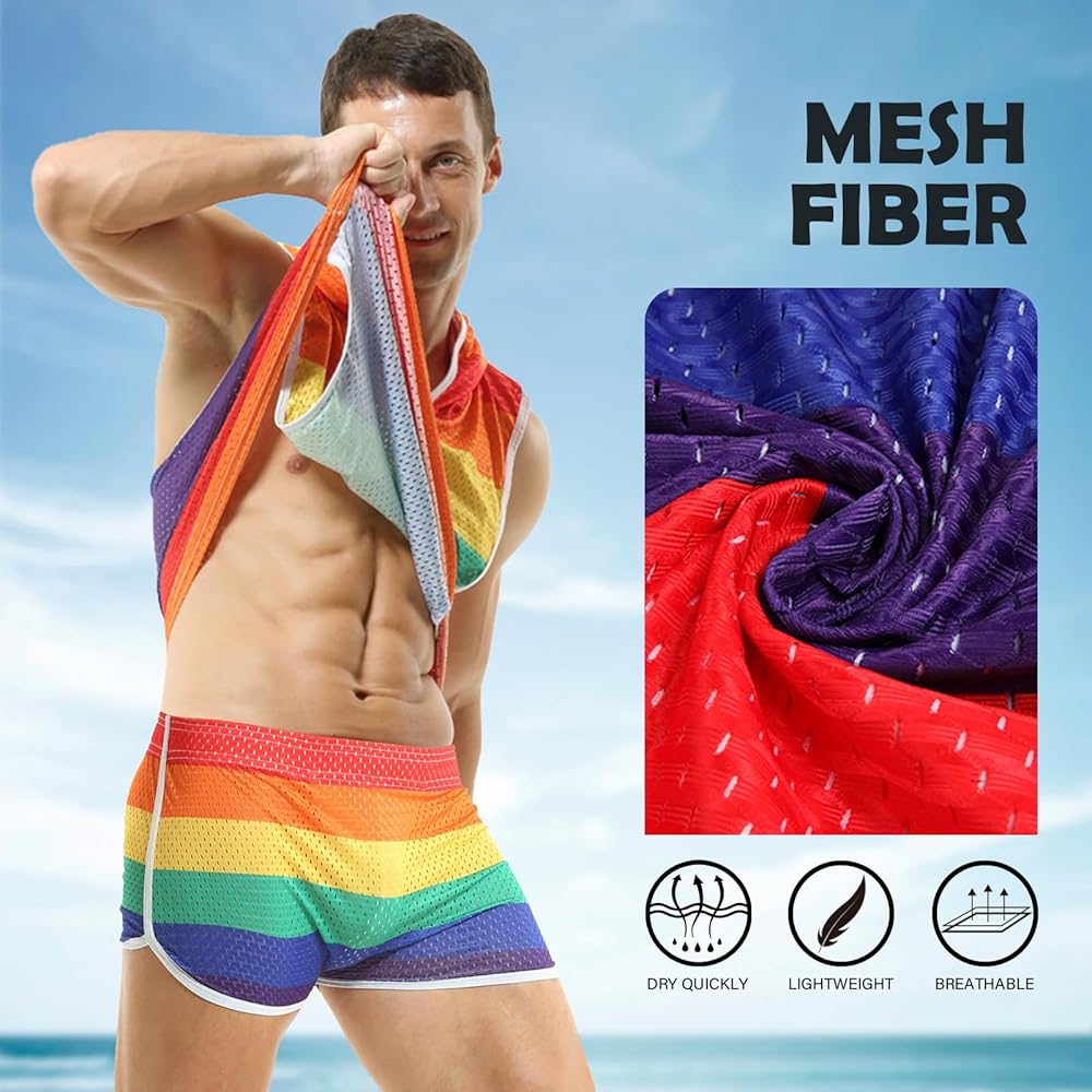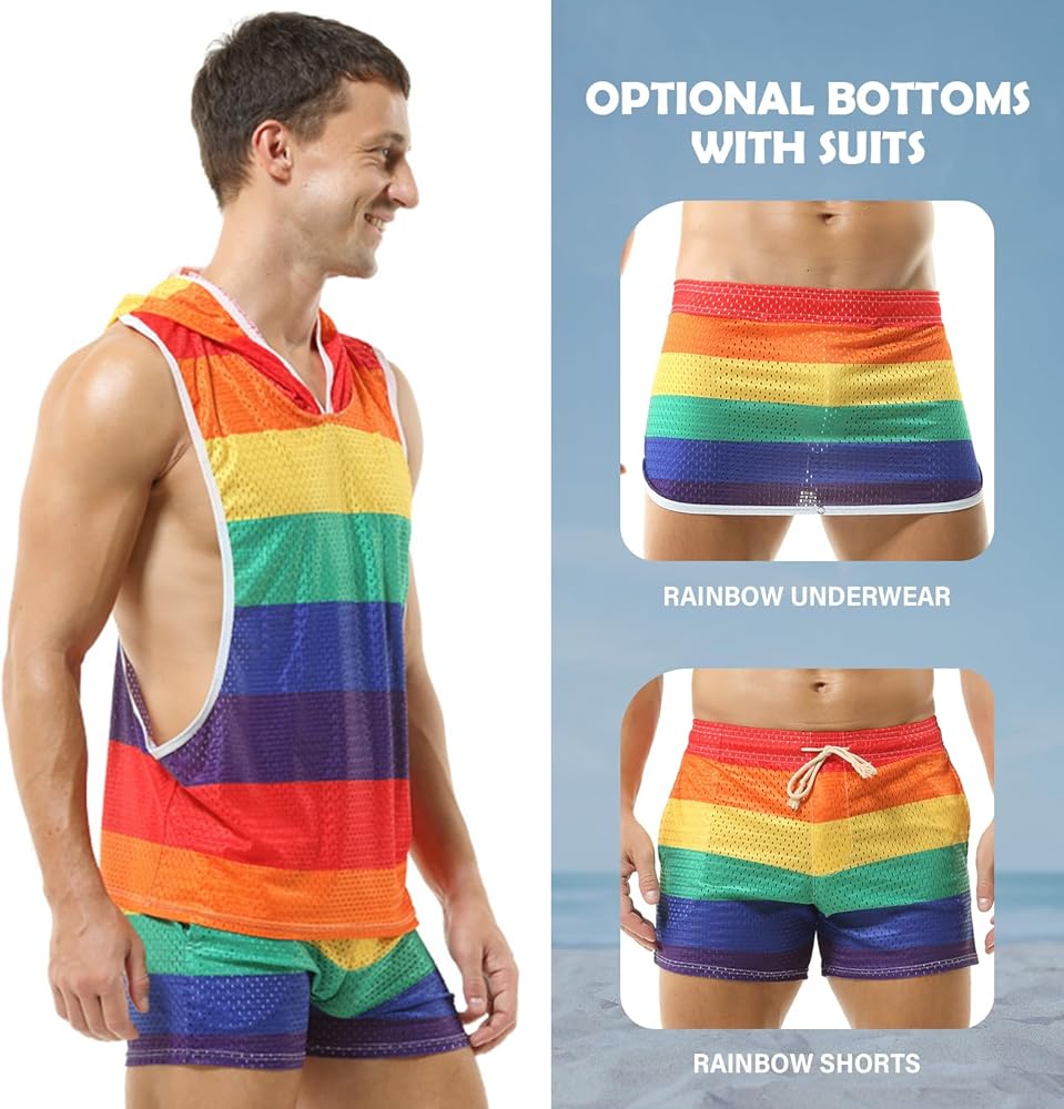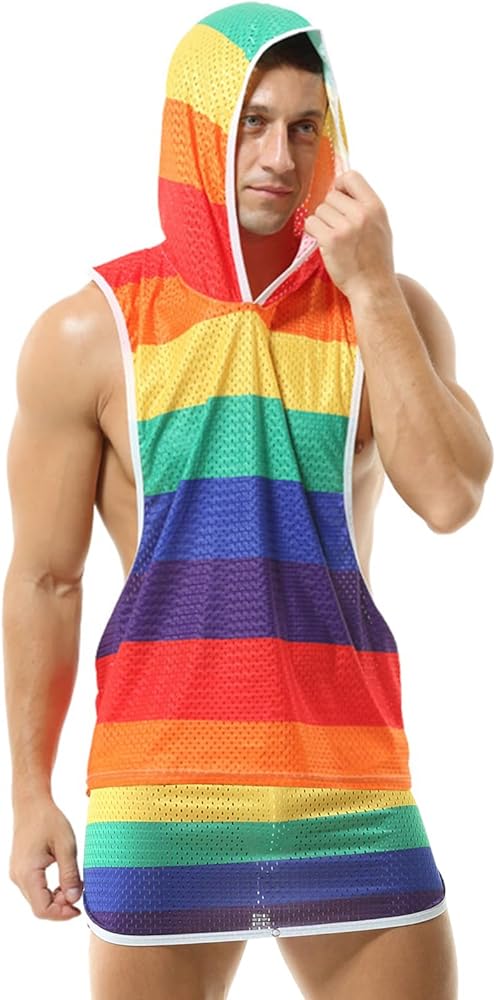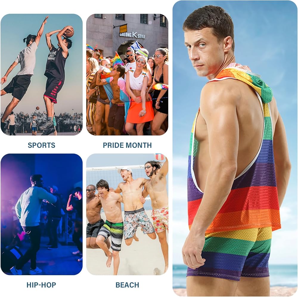 Top Design: Mens hooded tank tops feature pride rainbow stripes, the eye-catching color lets you get attention in the crowds. Featuring a hooded and Y-back design, rainbow mesh top shows your shoulders and arms muscles, creating a sexy and cool image.