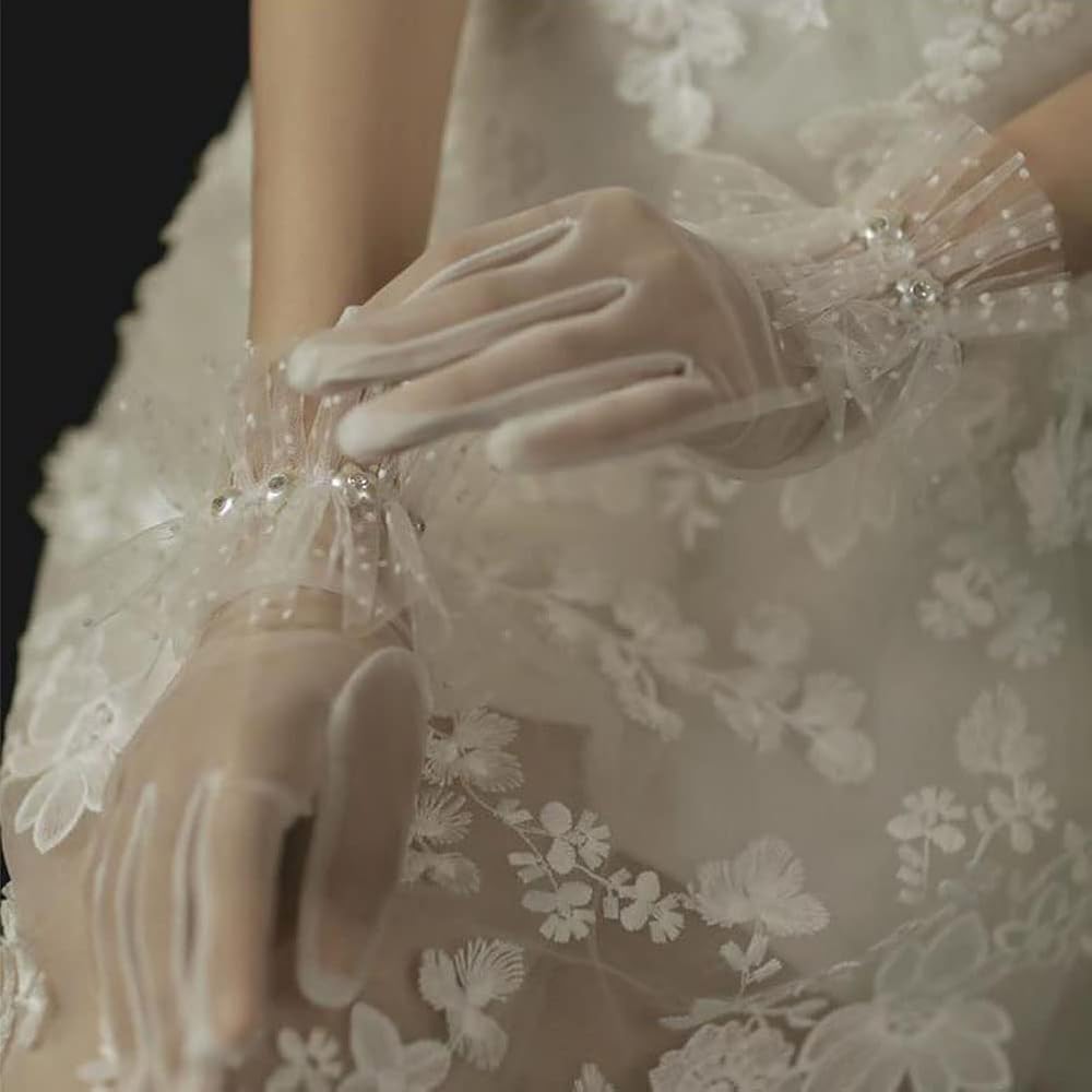 Simple and elegant sheer gloves with elegant pearls as decoration to add an elegant texture to any of your wedding dresses, suits, gowns. These women's lace gloves are feminine, show a glamorous charm and make any outfit look elegant.