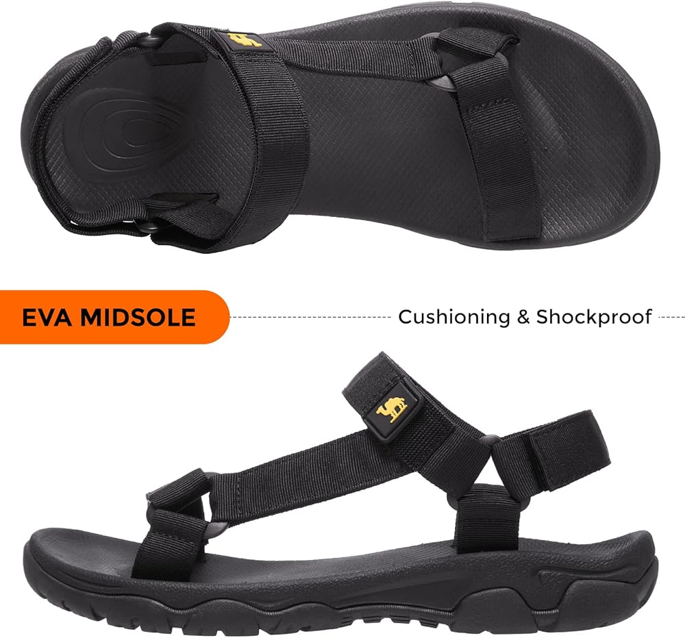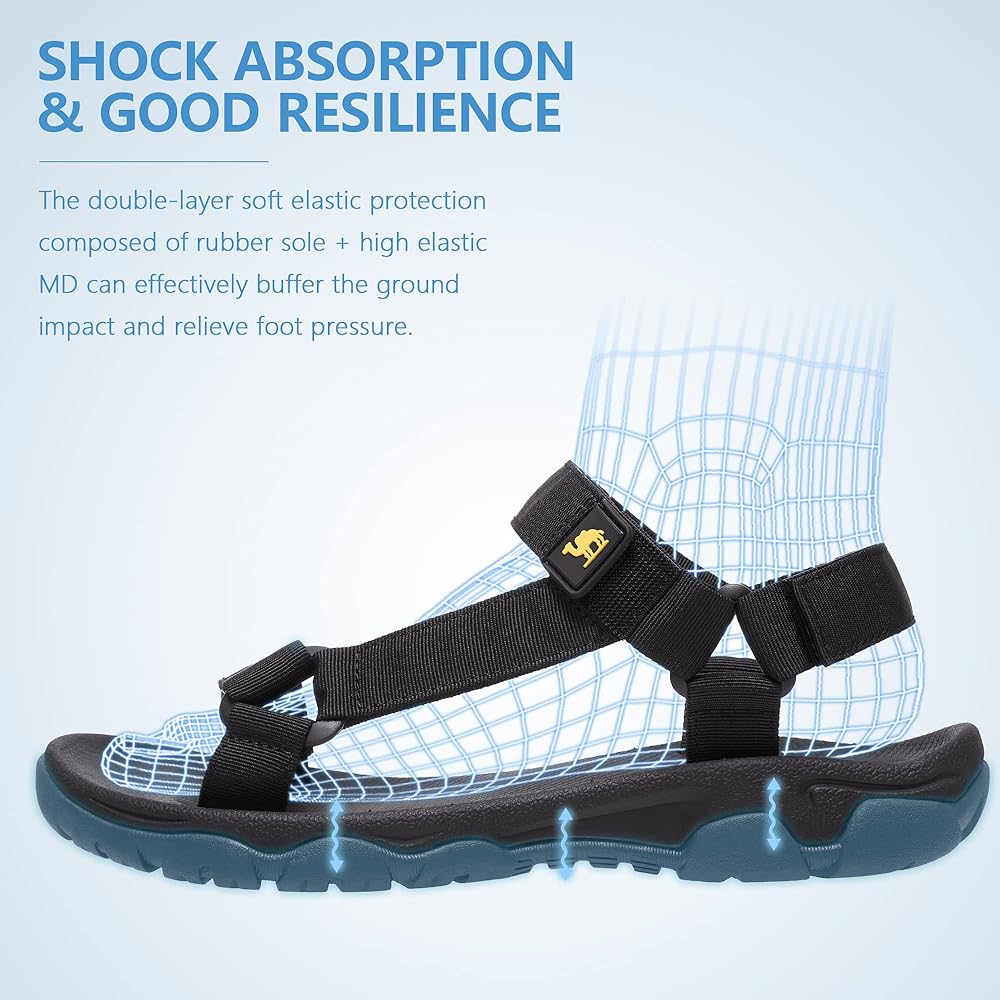 【EVA Footbed & Arch Support】—Soft EVA footbed absorbs impact. These athletic water sandals are fitted to the shape of the human foot and provide arch support to reduce pressure on the foot.