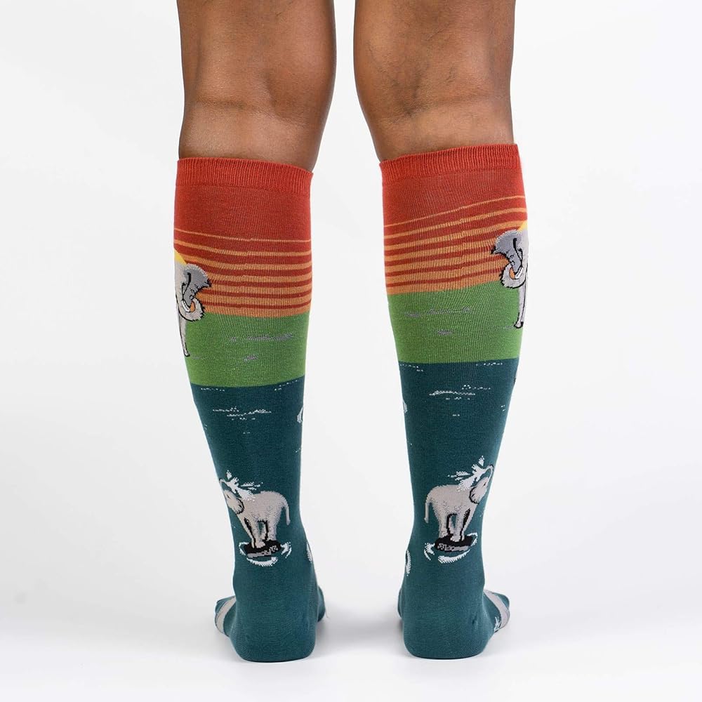 The savanna, where the elephant pack spends most of its day browsing for food, is hot and dusty. By midday, everything feels very dry. The cooling waters of the oasis call. The calves have been waiting all day for this. They charge into the water, followed by the rest of the pack, dampening their parched skin. They'll be back tomorrow to make another splash, and so can you, in these Make a Splash Crew and Knee High Socks.