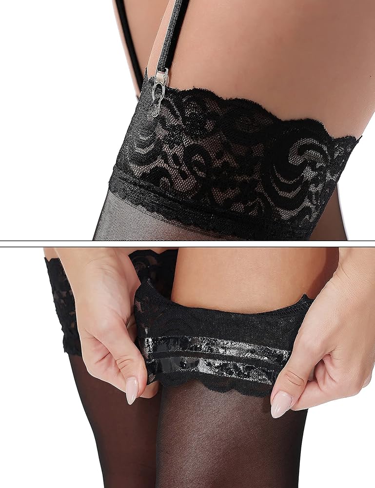 • 【Special Design】: Black lace eye mask bring elegant and mysterious feeling to your dress up, you will be eye-catching in nights. Lace top thigh high stocking have a sheer appearance, soft and silky, a must have for any lingerie outfit!