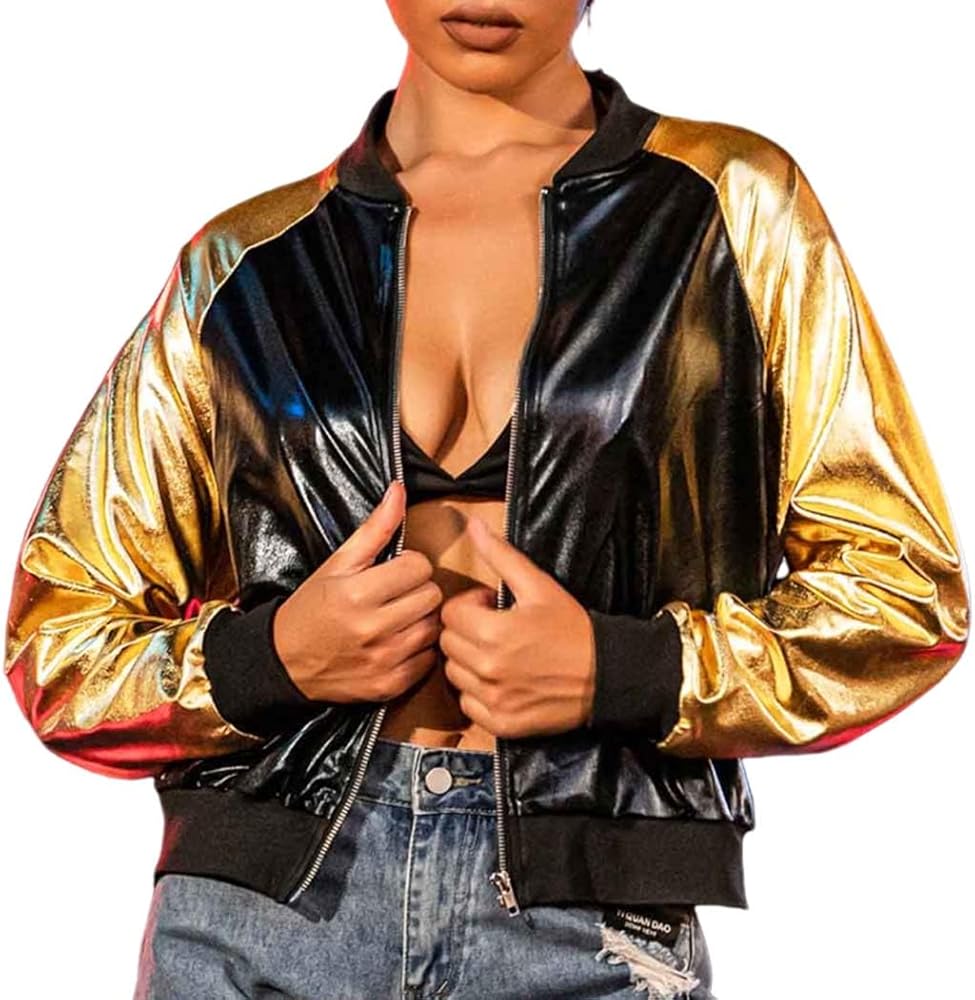 EVILD Women’s Bomber Jackets Long Sleeve Metallic Jacket Zipper up Collarless Sparky Bomber Blazers