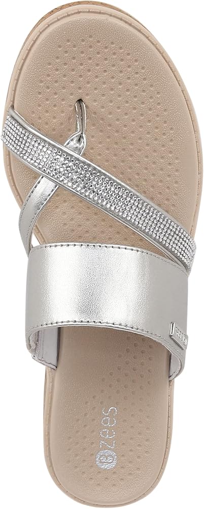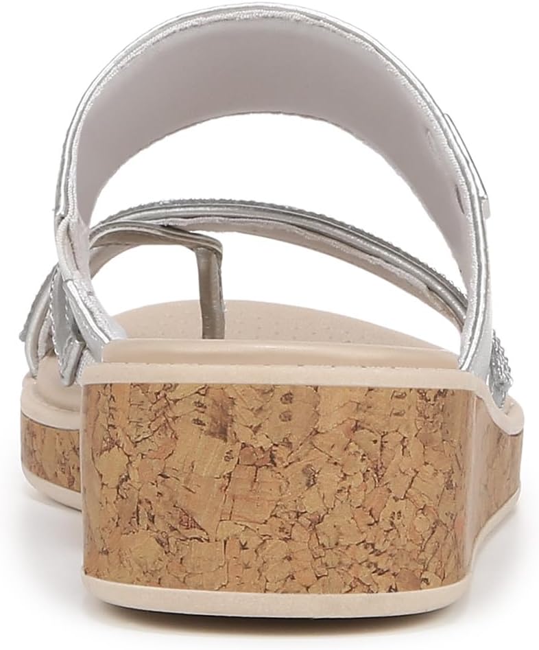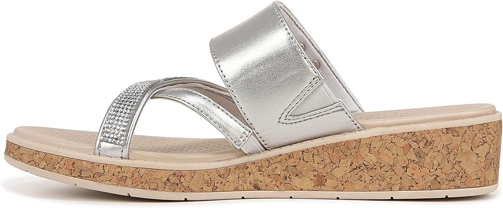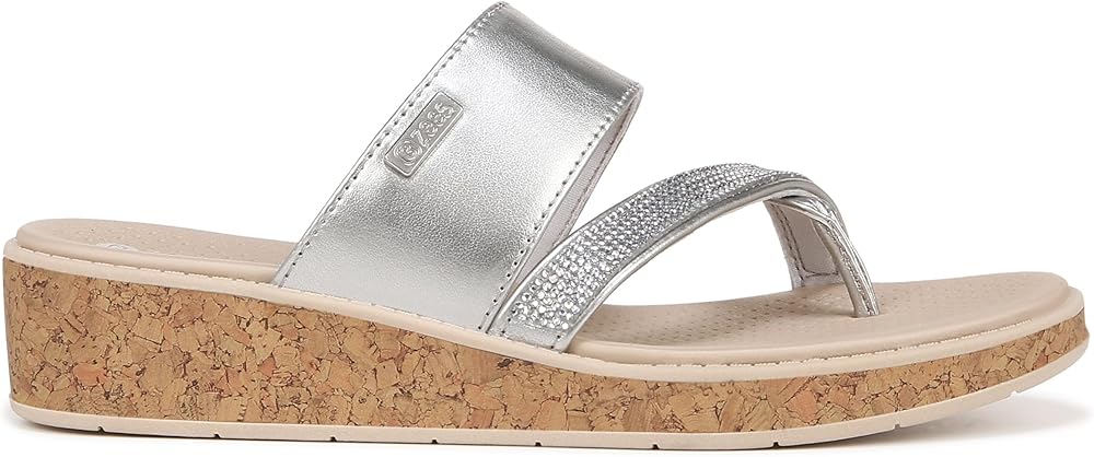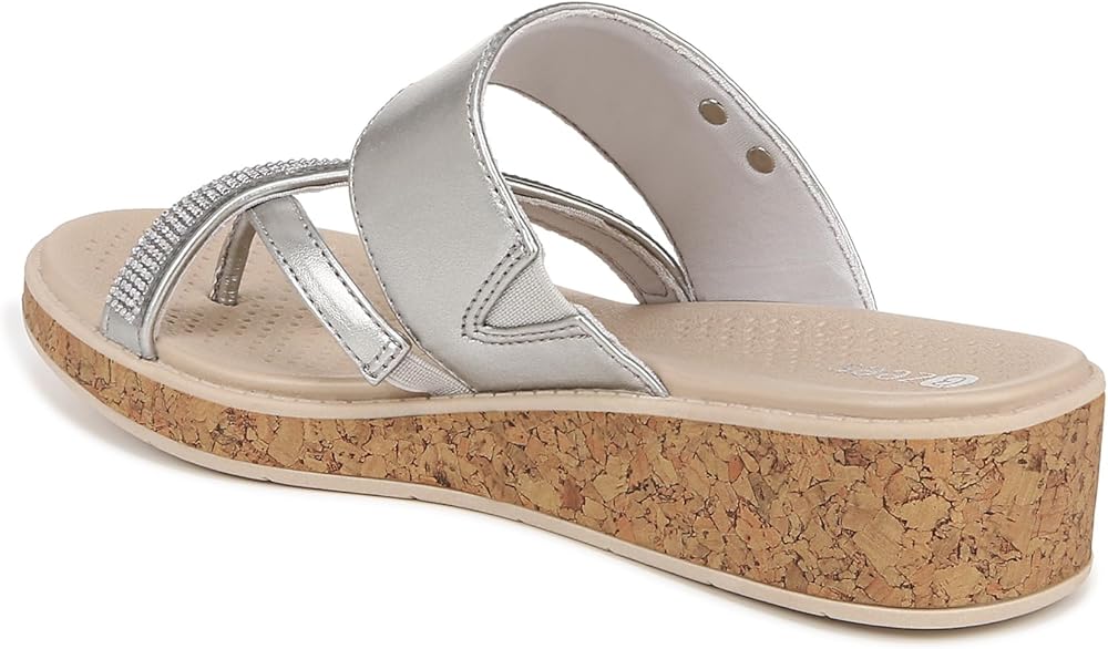 Make your sparkly statement! Our rhinestone sandals always add a sweet touch to your favorite outfits. Stretch synthetic upper with partially recycled lining and round toe. Slip on fit. BZEES Cloud Technology: Designed so you'll feel weightless, energized and free. Ultra Lightweight: Step lightly with a nearly weightless feel. Dynamic Stretch Uppers: Move freely in shoes with built-in stretch. FreeFoam™ Comfort: Low pressure insoles with maximum foot contact and cushy arch support. . 3/4 inch platform, 1 1/2 inch washable cork wedge heel. Get Width It: Countless pairs of Bzees come in wide width shoes for women. Machine Washable: Wash on cold and air dry.