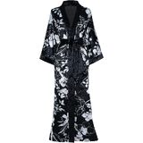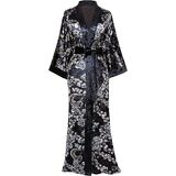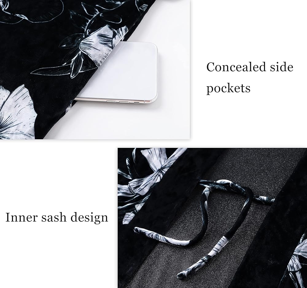 Features: Ultra-plush for cosy feels; self-tie waist with matching belt; two side pockets; open front; luxurious golden print drape.